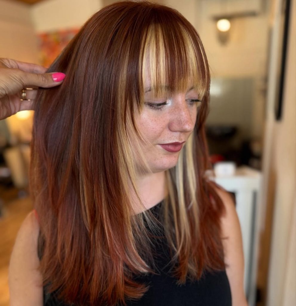 This hairstyle is playful and modern, blending crimson red with blonde peekaboo bangs that immediately draw attention to the eyes. It’s daring without being over-the-top, striking the perfect balance between edgy and feminine.