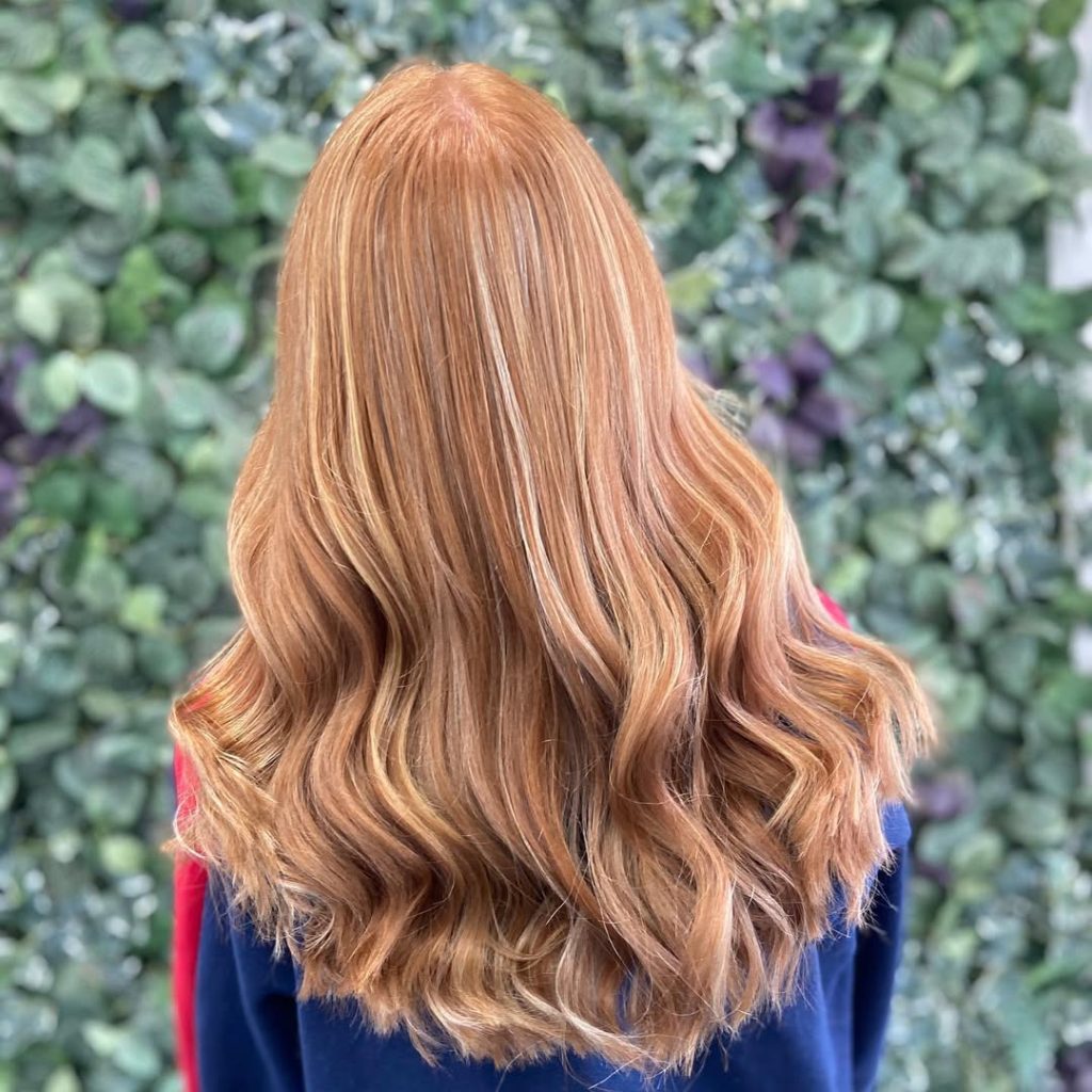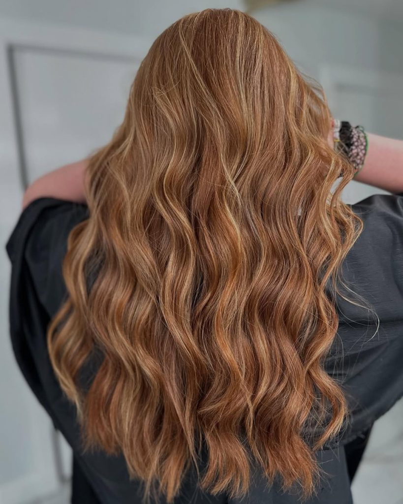 Here we have a beautifully blended auburn balayage infused with honey blonde dimension. The waves enhance the soft transitions between shades, creating a look that feels luxurious and effortless at the same time.