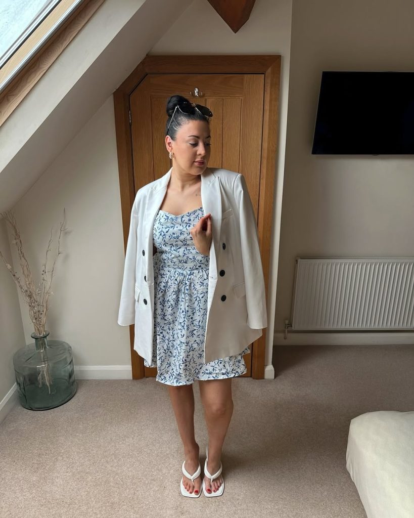 11. Soft Blue Floral Dress with Tailored Blazer
