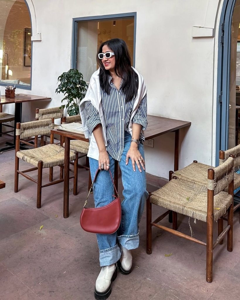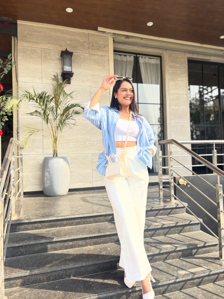 A light blue striped shirt layered over a white crop top paired with high-waisted white trousers offers modern brunch confidence.