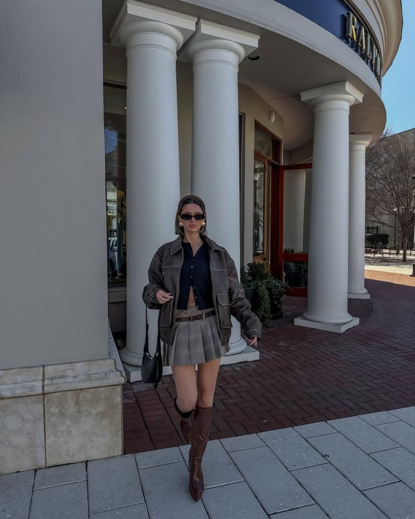 There’s something undeniably Chic about mixing preppy structure with edgy leather. The pleated Skirt keeps the silhouette youthful and slightly Girly, while the jacket adds confidence—perfect for an Early, slightly Cold morning in Nyc.