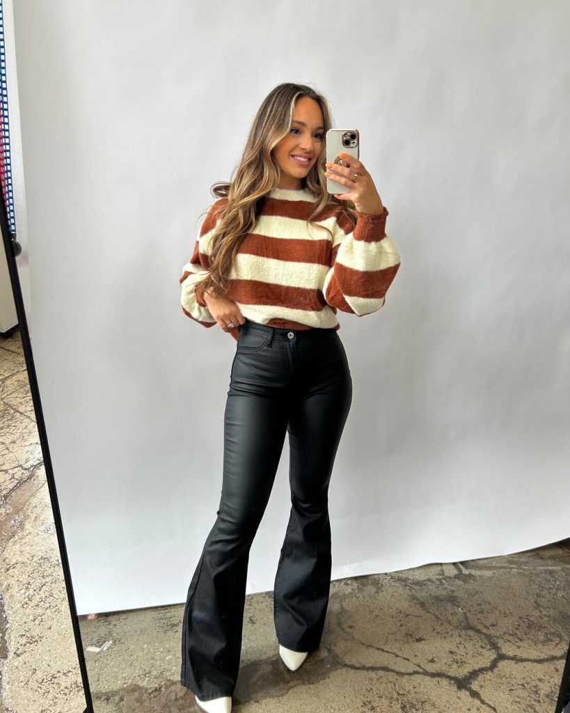 A soft striped sweater paired with flared leather pants balances comfort and polish.
