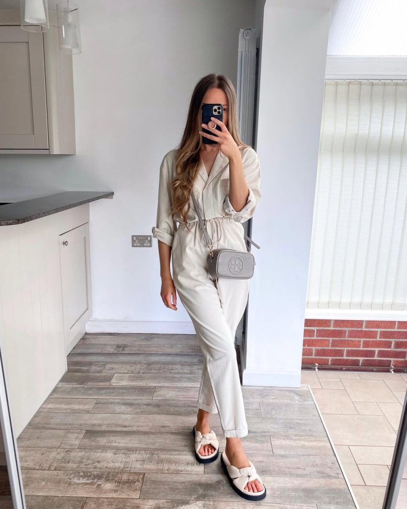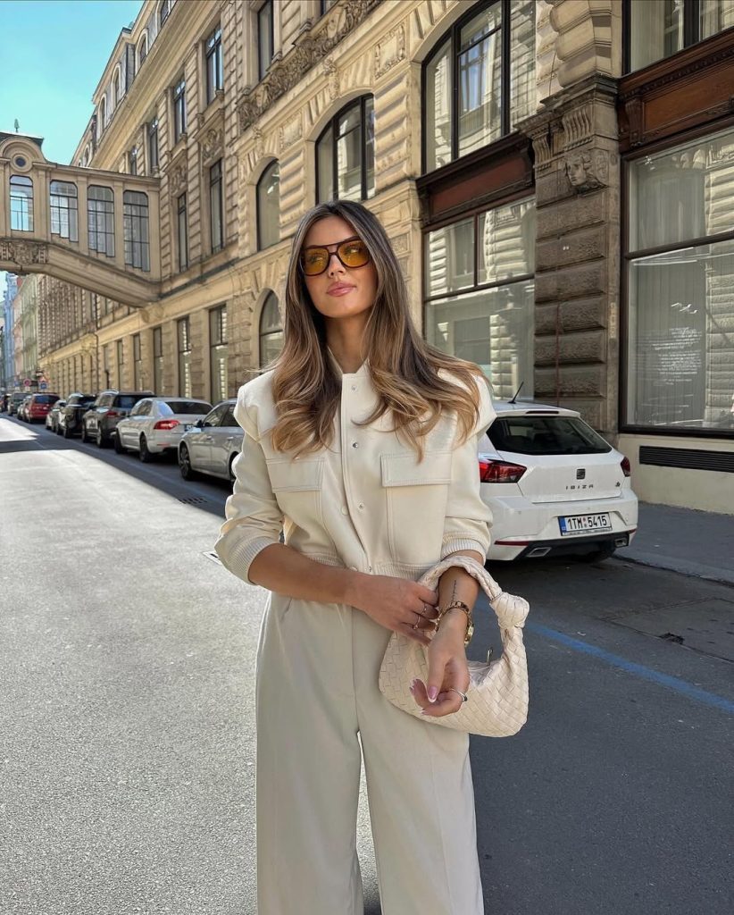 An all-cream jumpsuit channels elevated minimalism with urban polish.