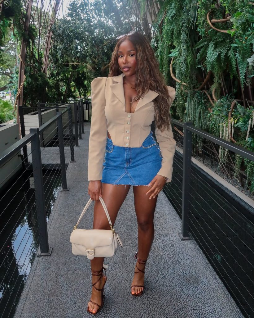 A sculpted blazer-style top paired with a denim mini offers sleek brunch sophistication.