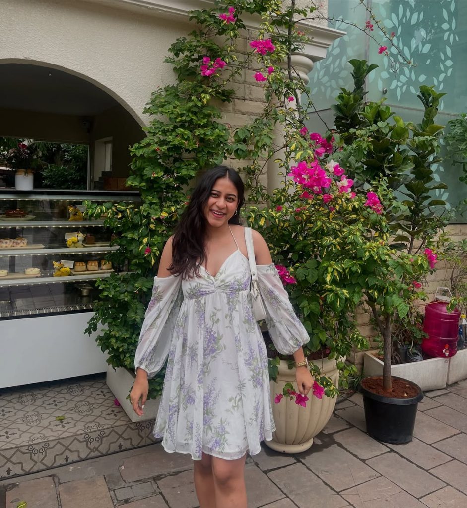 This look leans toward a slightly Girly, Cute aesthetic that feels perfect for spring patios surrounded by flowers. The off-shoulder detail adds subtle elegance while keeping the outfit playful and relaxed.