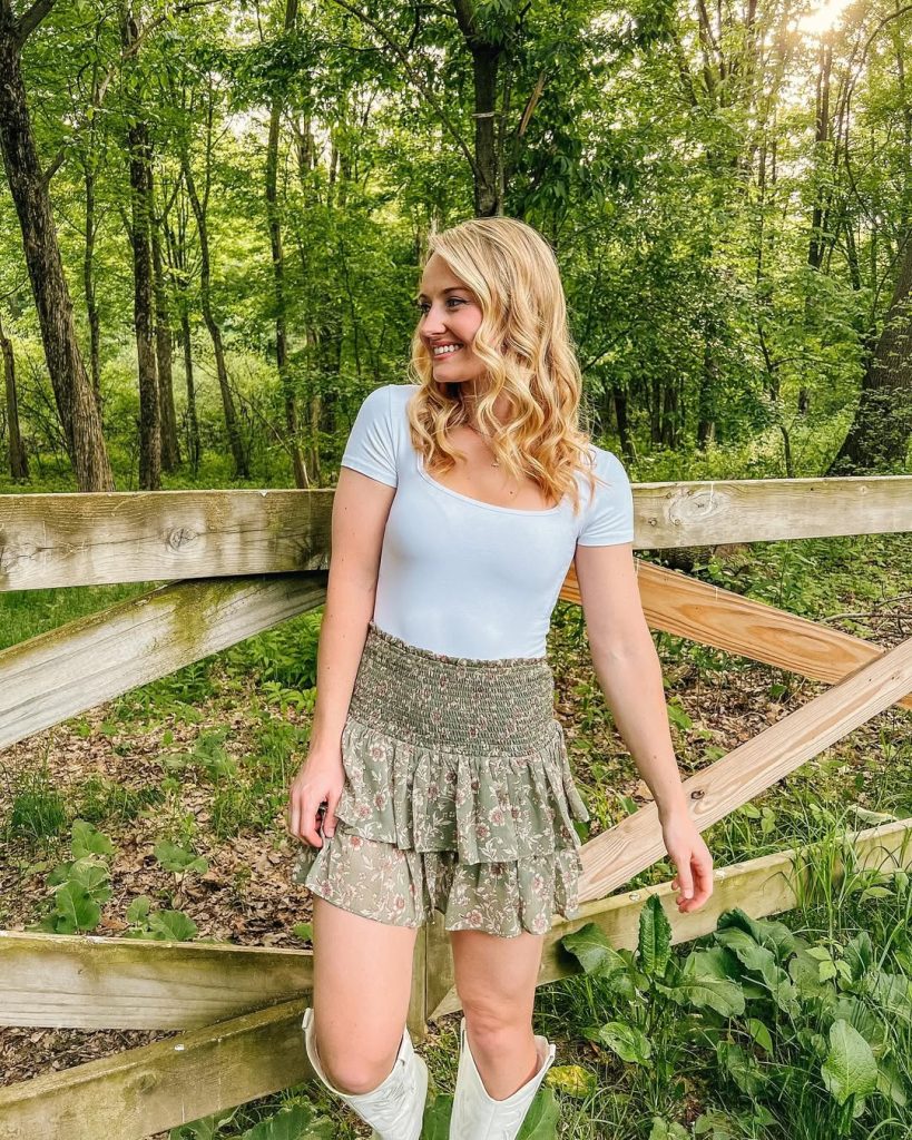 A floral skirt, paired with a fitted tee and boots, blends rustic charm with modern brunch style.