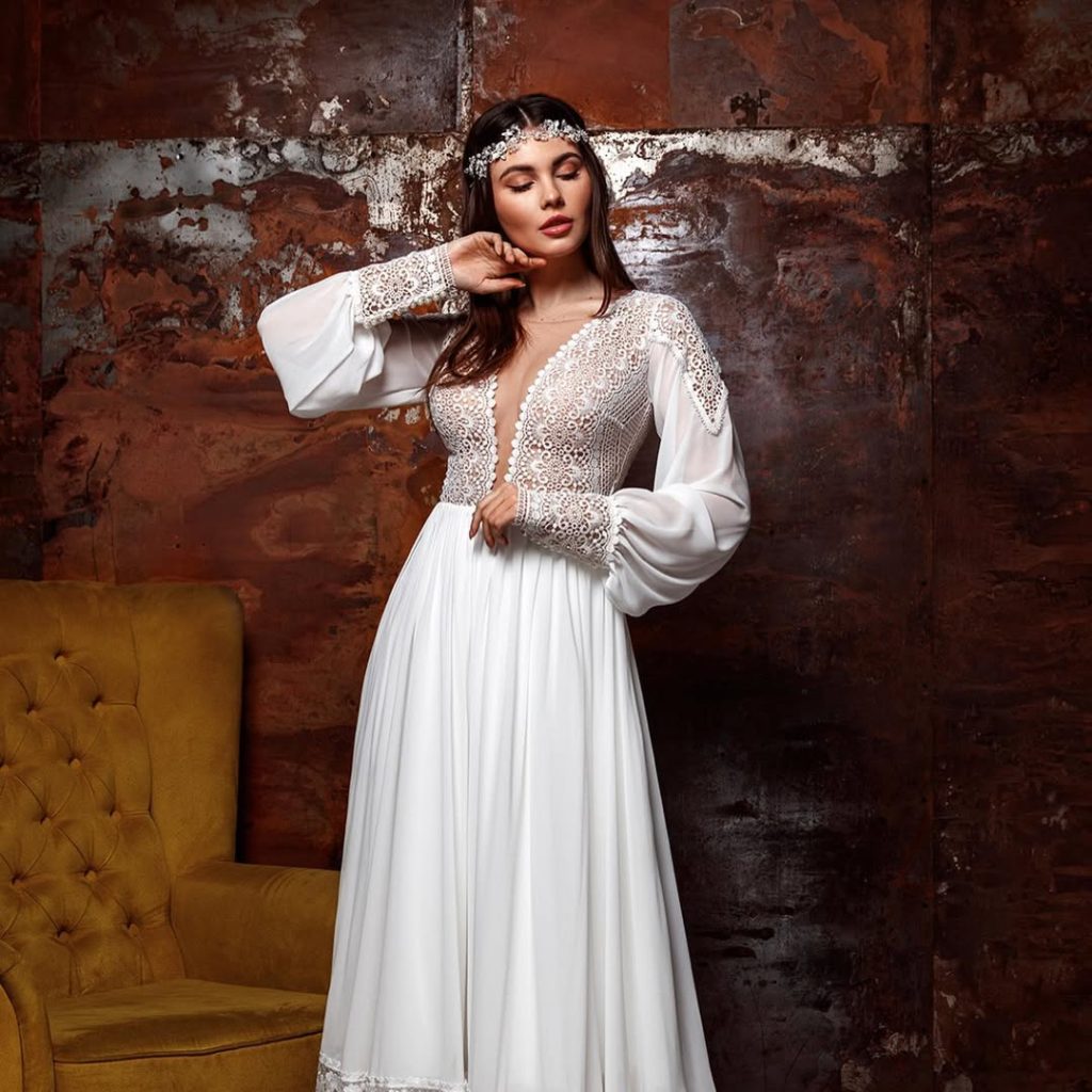 A lace gown with sheer sleeves and a fluid silhouette feels effortlessly aligned with open-air spring ceremonies.