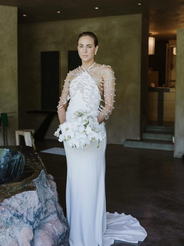 A streamlined gown adorned with delicate pearl strands offers a refined interpretation of modern bridal-inspired fashion.