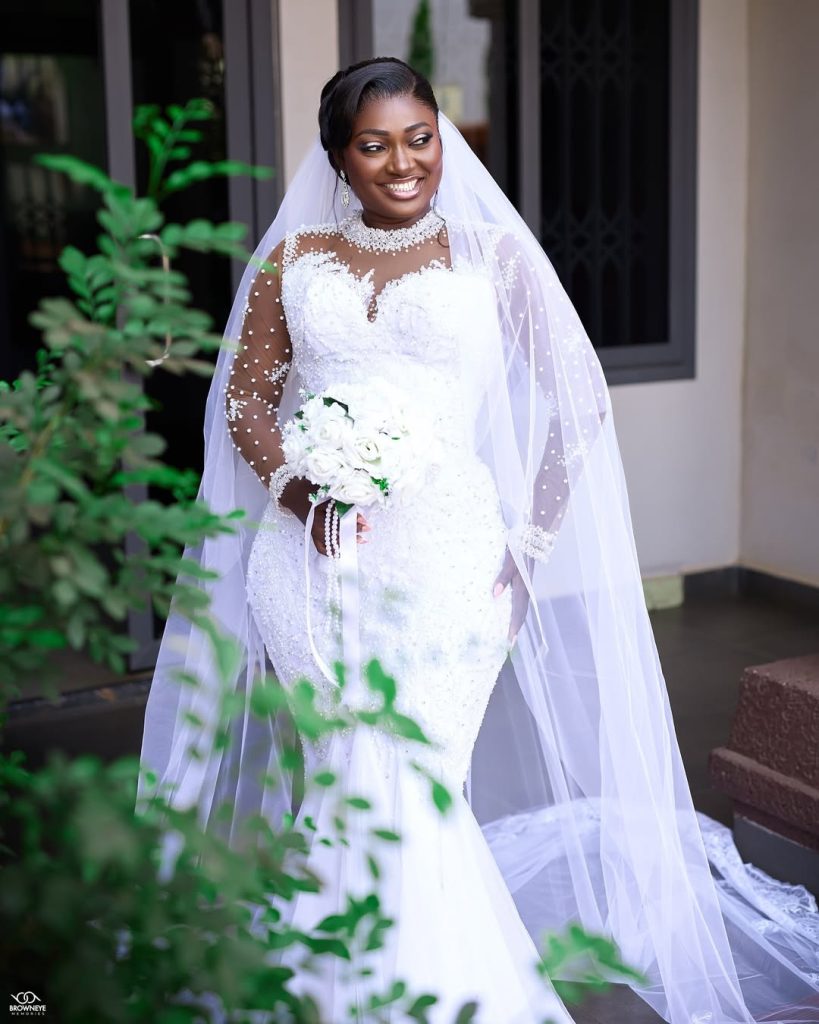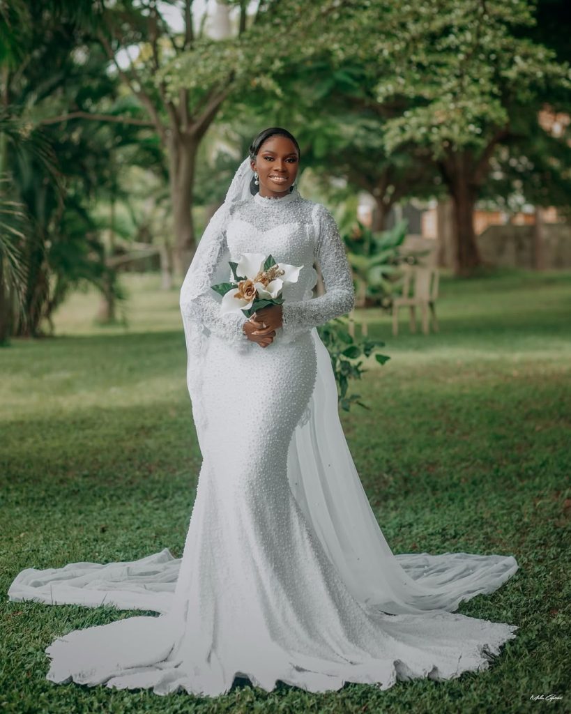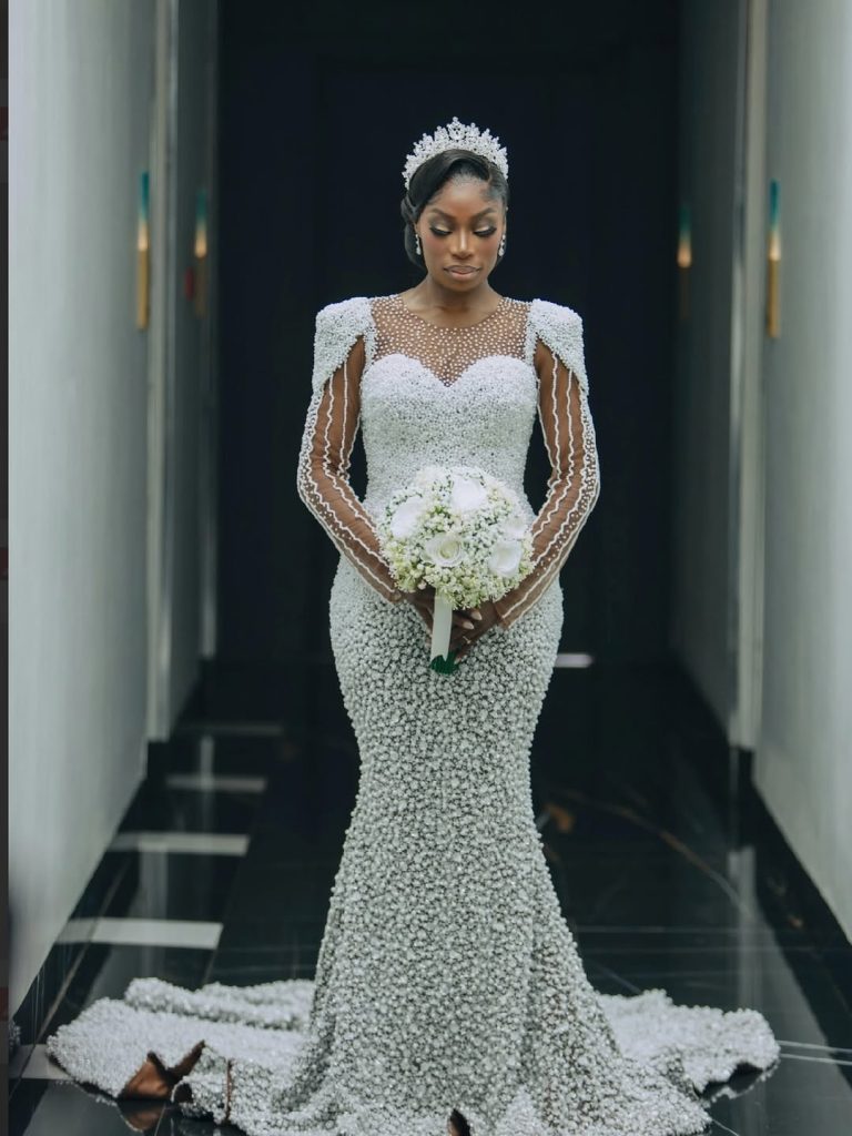 A pearl-covered gown with sheer detailing creates a regal silhouette that feels both commanding and refined.