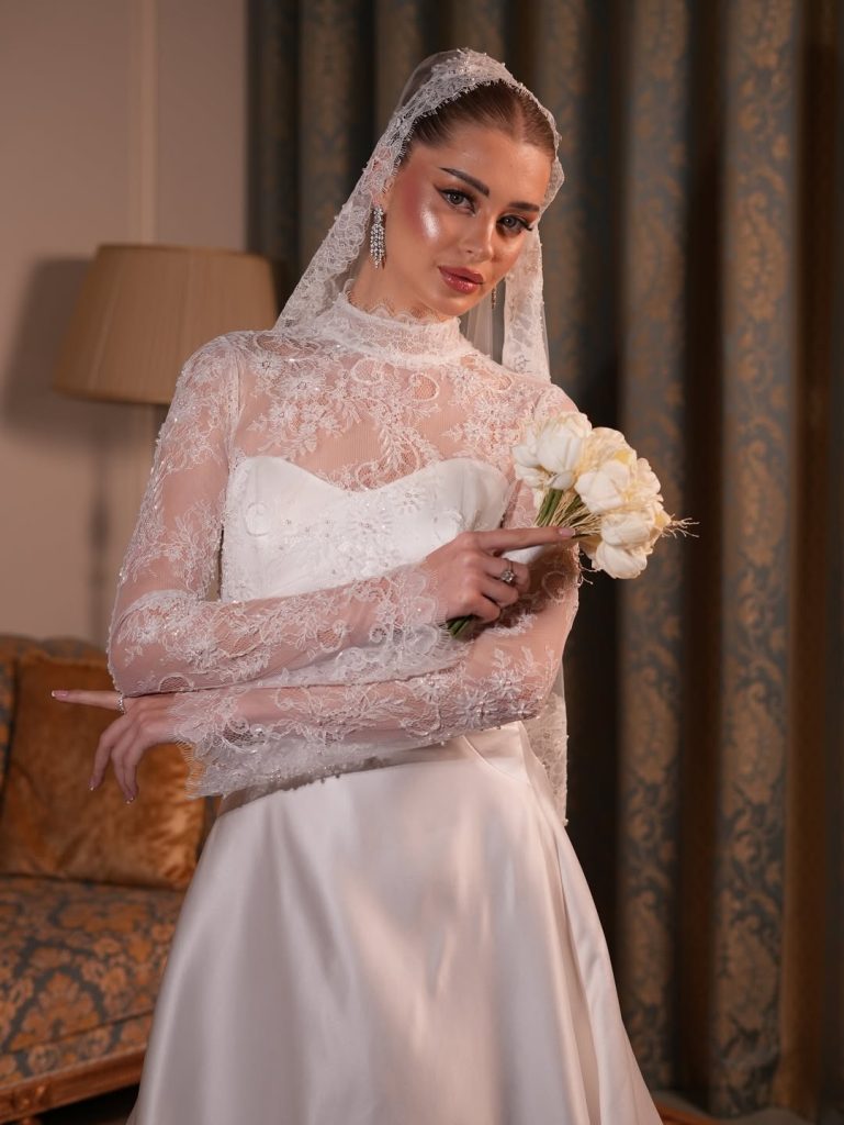 A high-neck lace gown layered over a smooth satin base delivers refined vintage elegance with modern restraint.