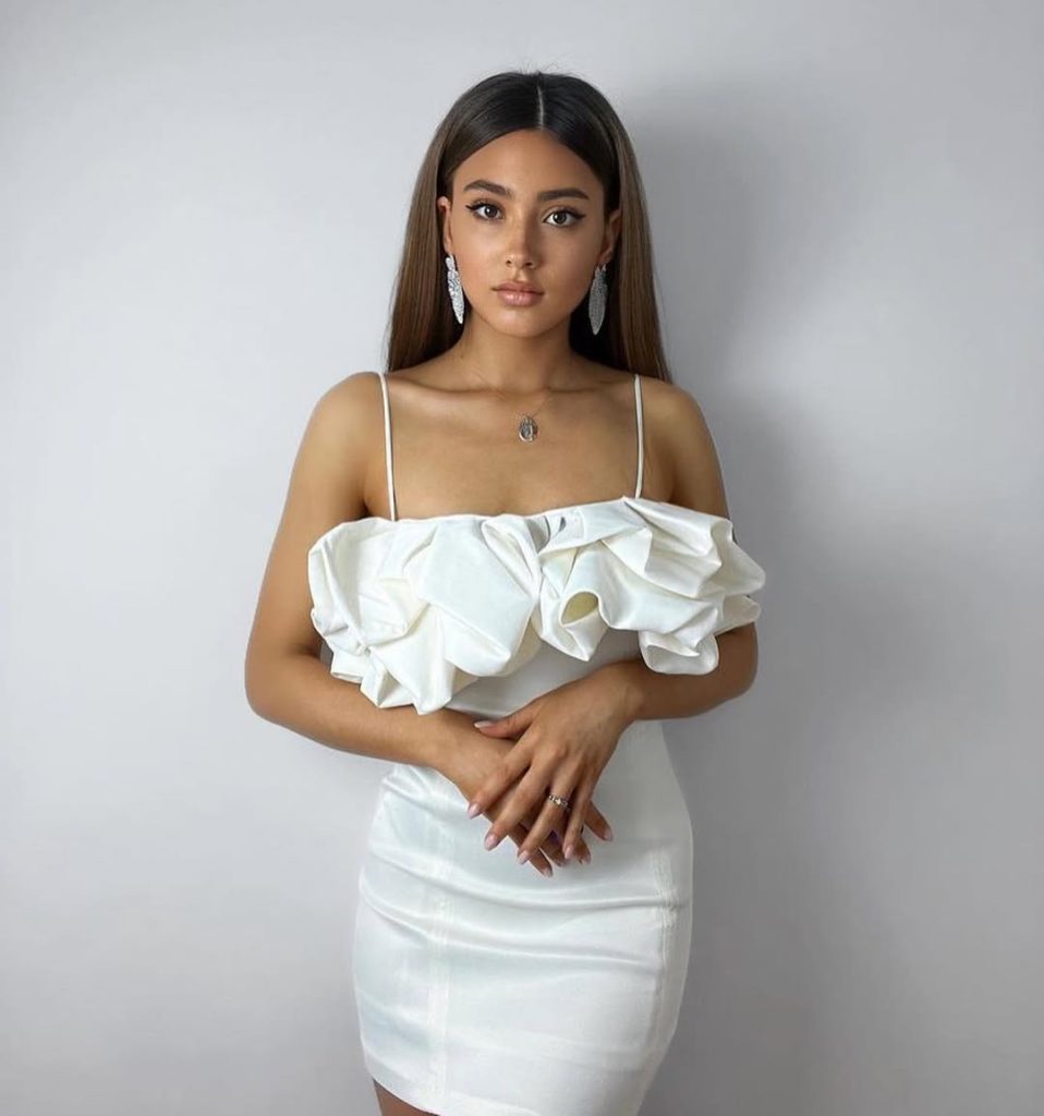 This short ivory dress with sculpted ruffles brings a youthful, romantic energy that feels effortless rather than costume-like.