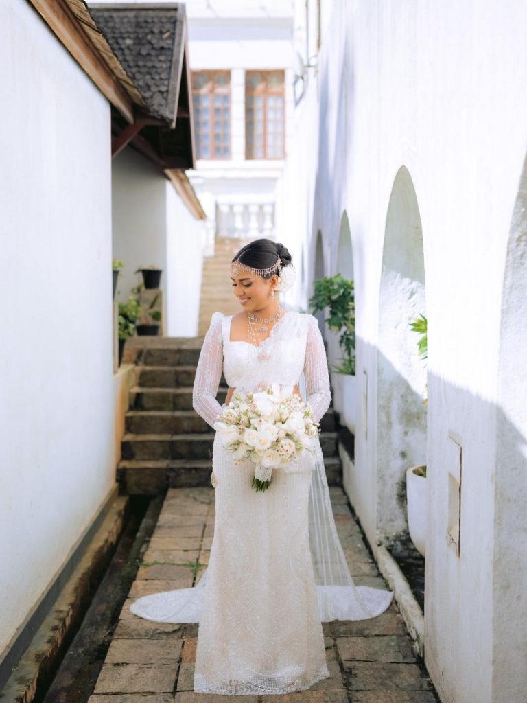 A traditional-inspired gown styled with delicate jewelry and a soft veil radiates grace and serenity in a sunlit architectural setting.