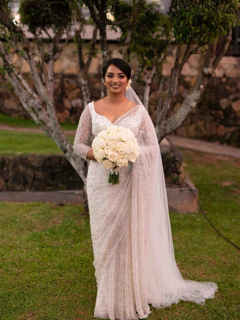 This gown is ideal for a formal evening wedding, where guests expect elegance but welcome individuality. Keep makeup luminous and accessories restrained to maintain balance. Avoid layering shawls or heavy wraps, as they distract from the gown’s carefully crafted neckline and silhouette.
