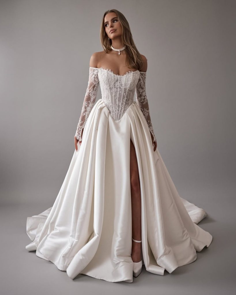 An opulent off-shoulder gown with layered lace and a voluminous skirt captures couture romance at its most expressive.