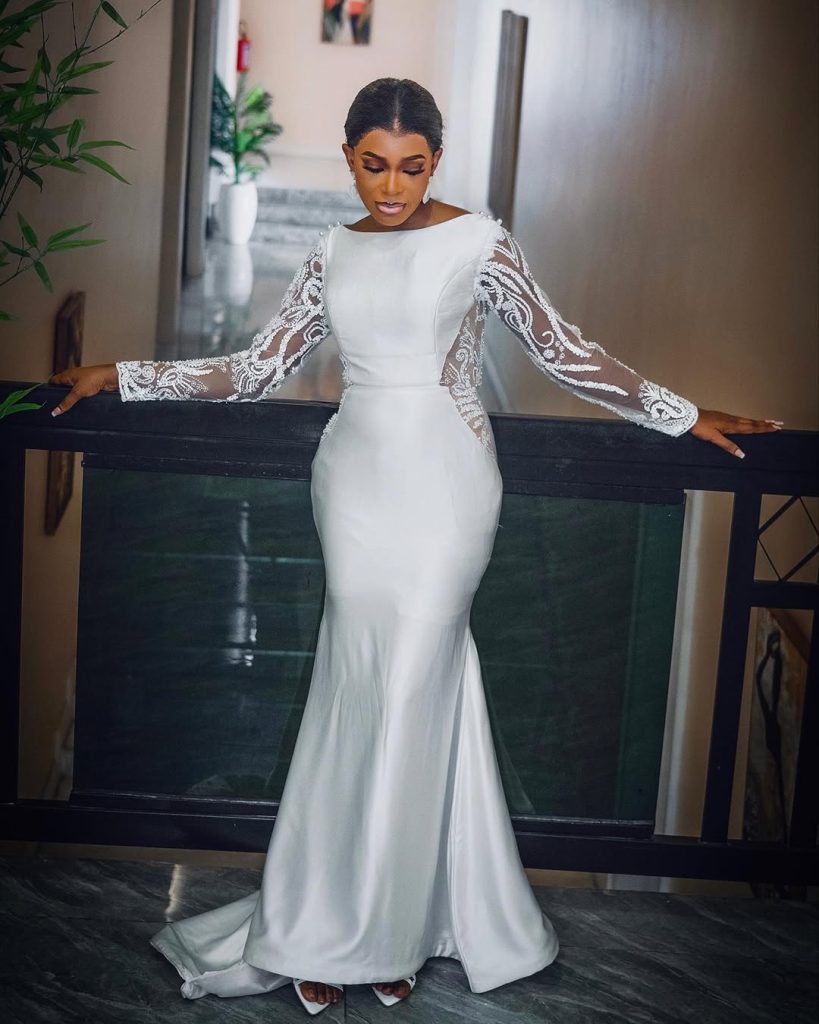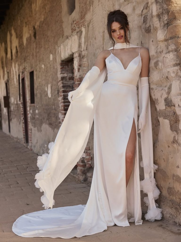A fitted white gown with sheer sleeves and delicate embellishment offers timeless sophistication with a modern sensibility.