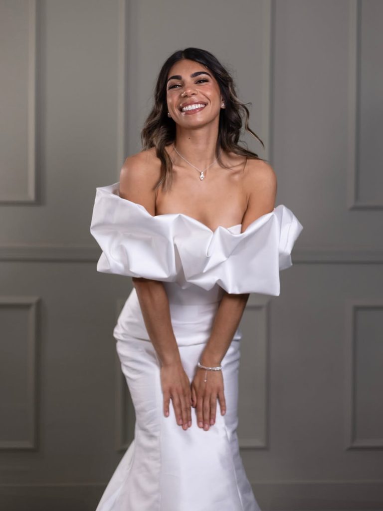 A short, structured dress with a softly flared skirt delivers bridal charm with a lighthearted, modern twist.