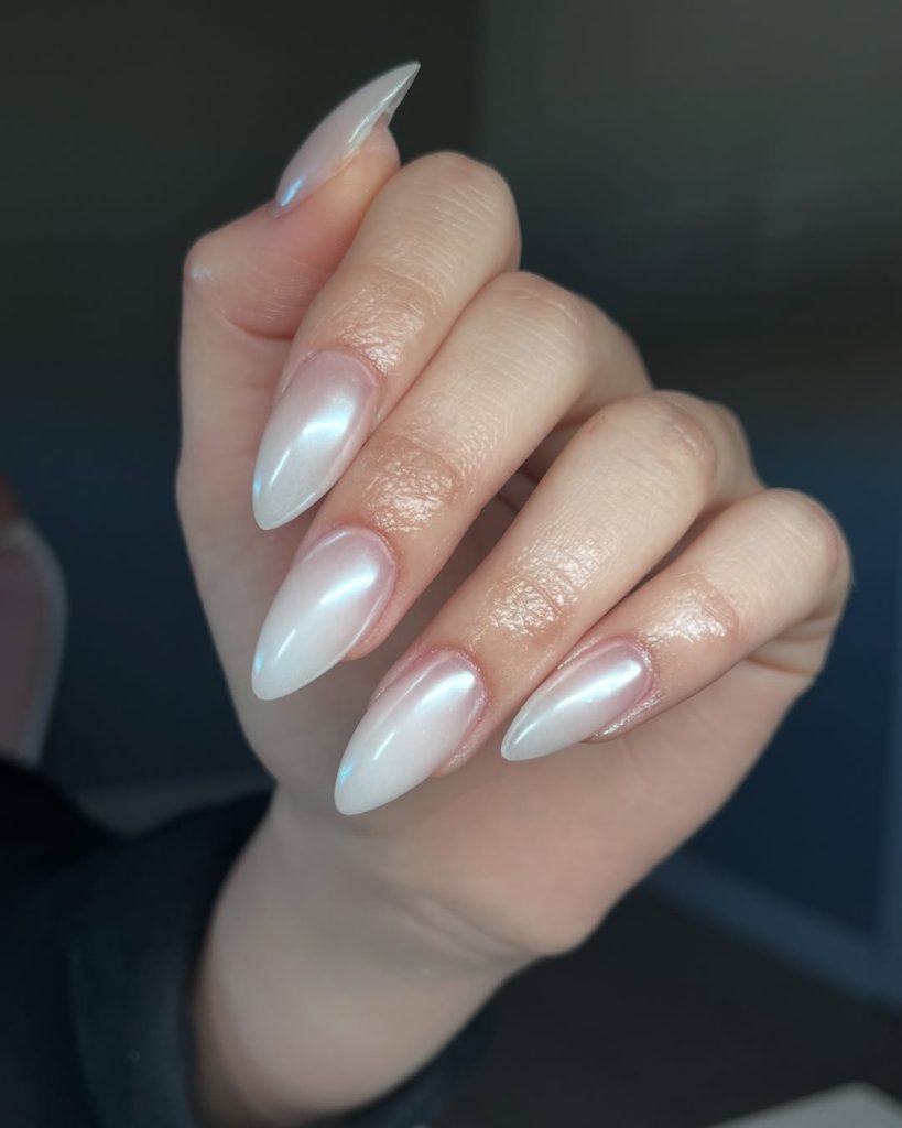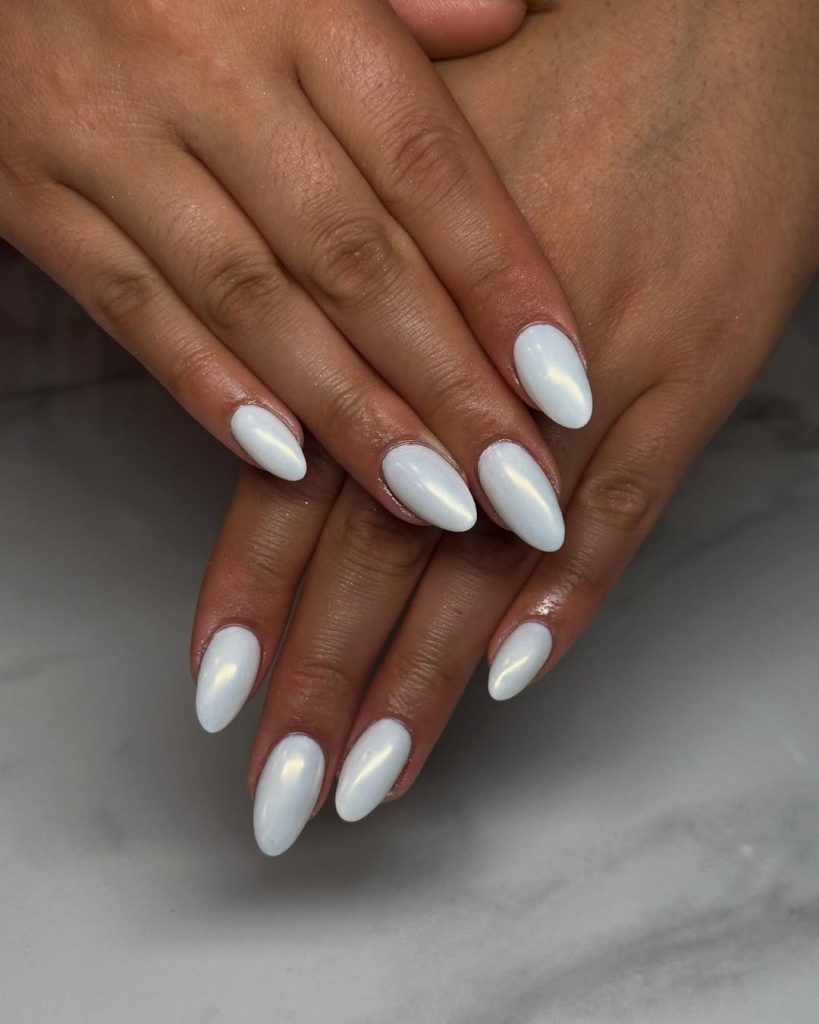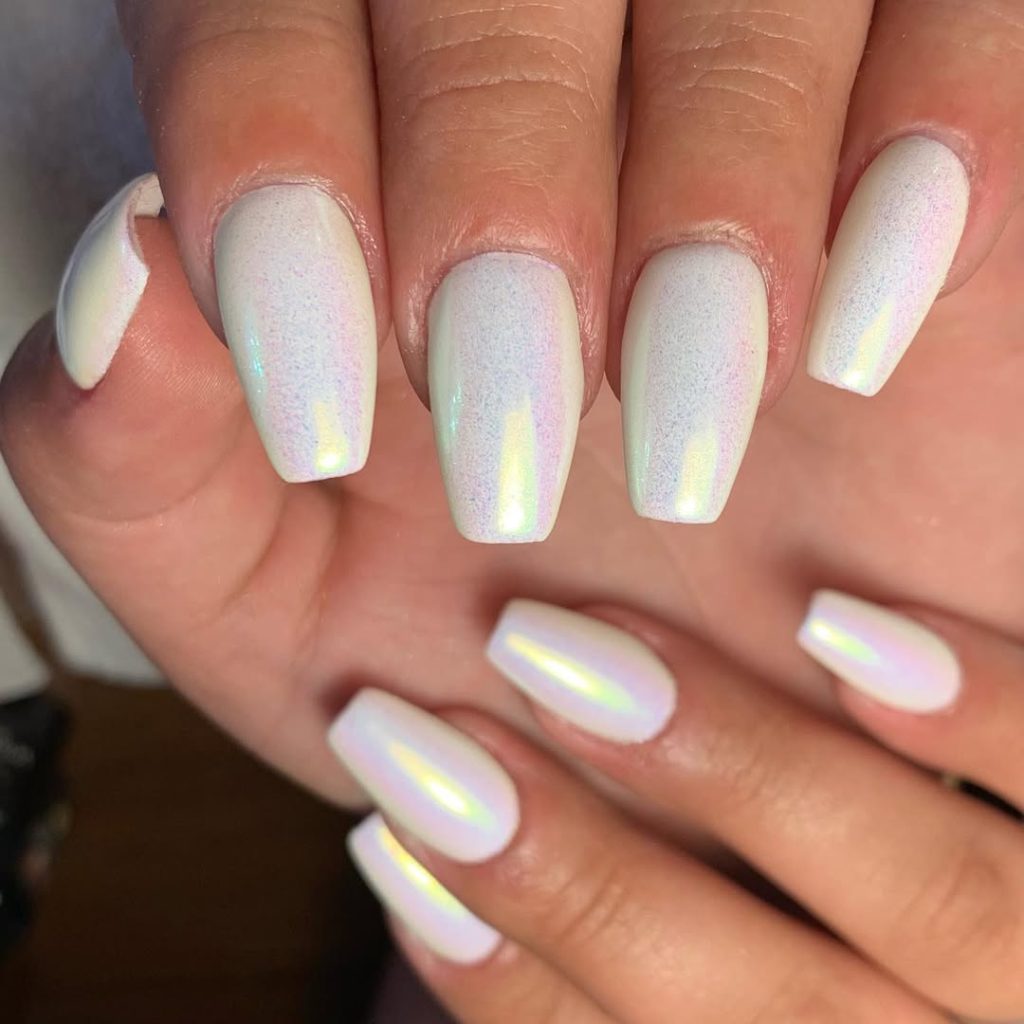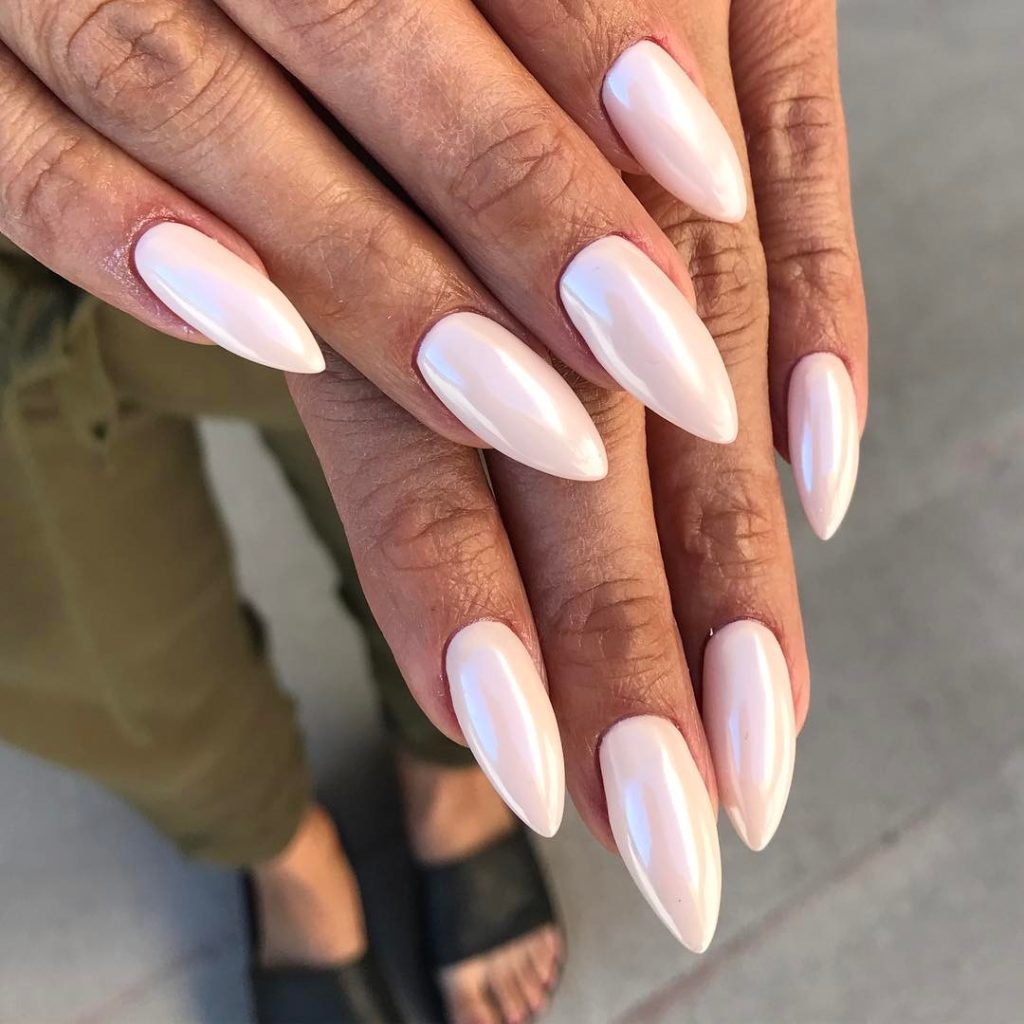 These nails are particularly striking should you like the look of having long nails without them being altogether pointed. Almond-shaped nails keep them feminine enough to be practical as well as long enough to add elegance to your hands. The white chrome with a soft pearly gloss looks incredible on both light and darker skin tones, which makes it one of the most versatile options you could try.