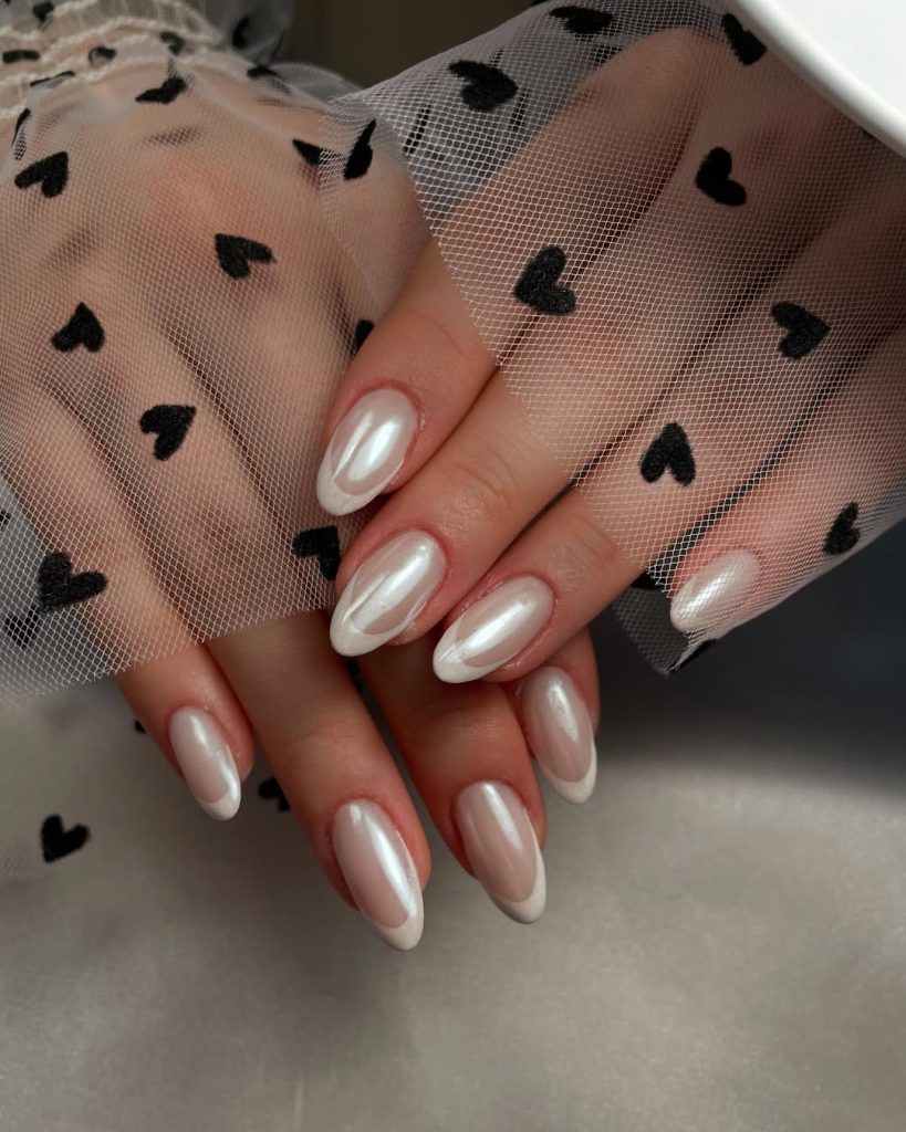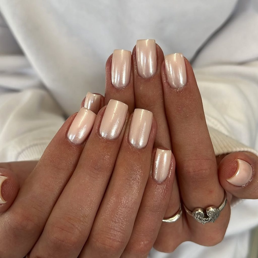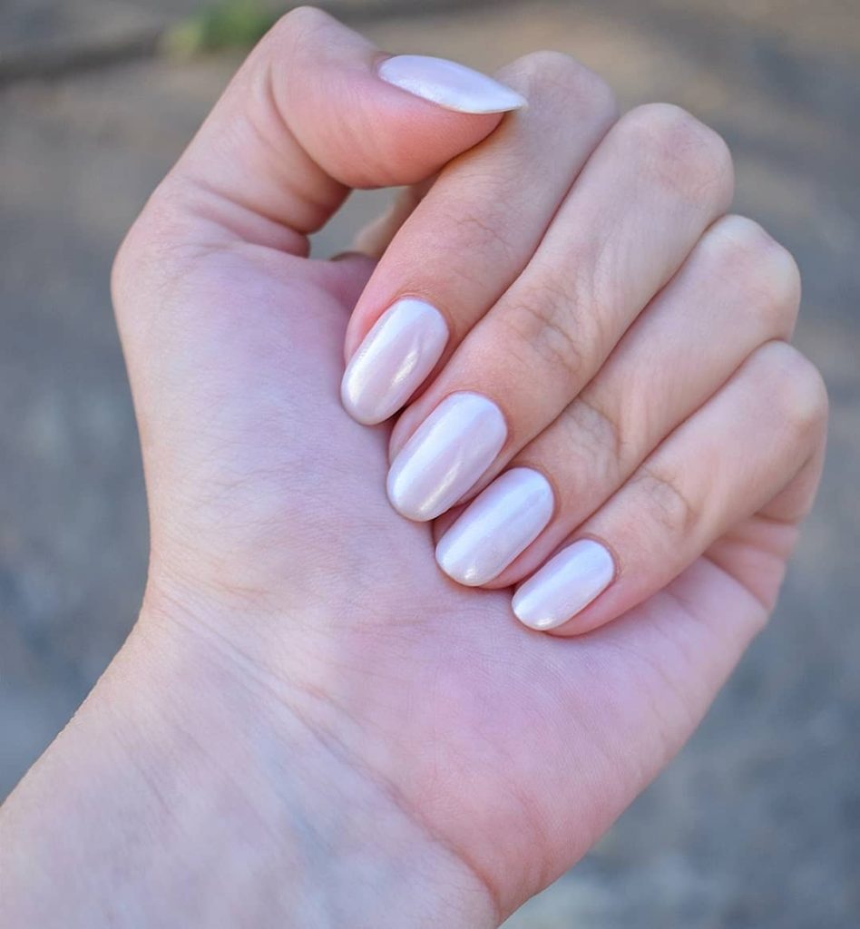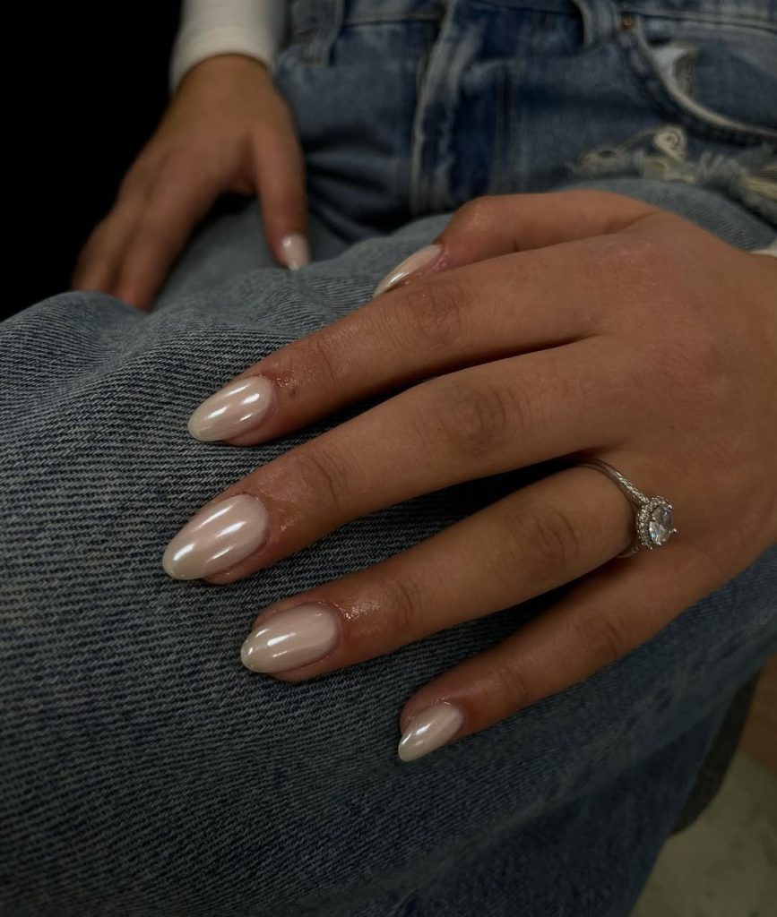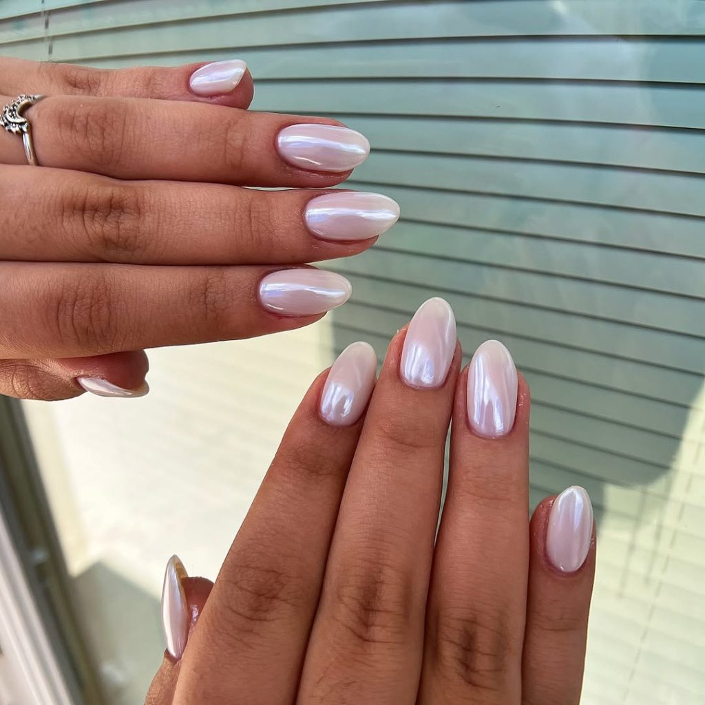 Softly rounded nails brushed with pearly chrome create a clean, delicate look. They give off that fresh bubble bath glow, perfect for when you want your nails to feel polished but not overdone. The finish is luminous, catching light with a subtle radiance.
