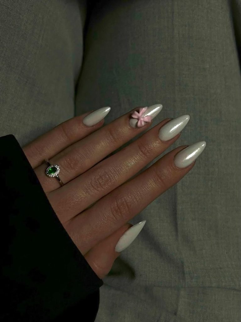 Here’s where glam meets girly—sleek white chrome nails adorned with a playful 3D pink bow. The glossy finish makes them look polished and modern, while the bow adds a sweet, feminine touch. It’s the kind of manicure that instantly feels like a statement piece.
