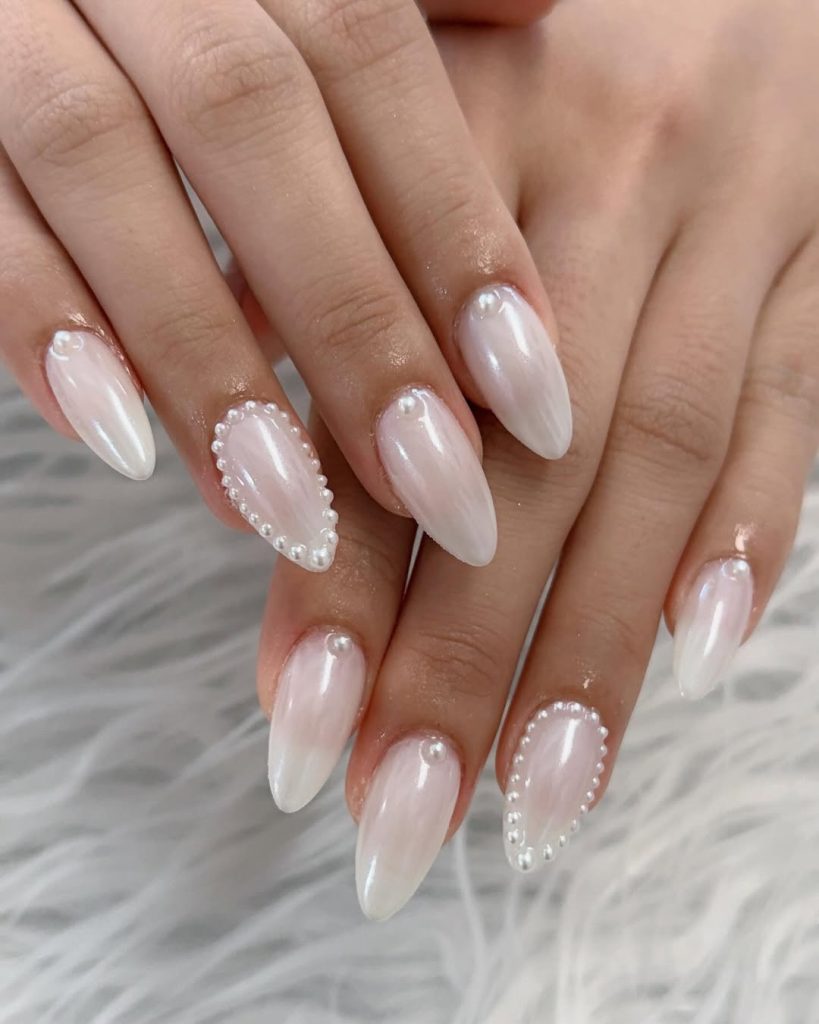 Pearl-studded designs like this are perfect for weddings, parties, or any event where you want your nails to feel like jewelry. The almond shape complements the embellishments beautifully, while the chrome base ties it all together with a luminous finish. Be sure to seal the pearls with a strong gel topcoat for durability.
