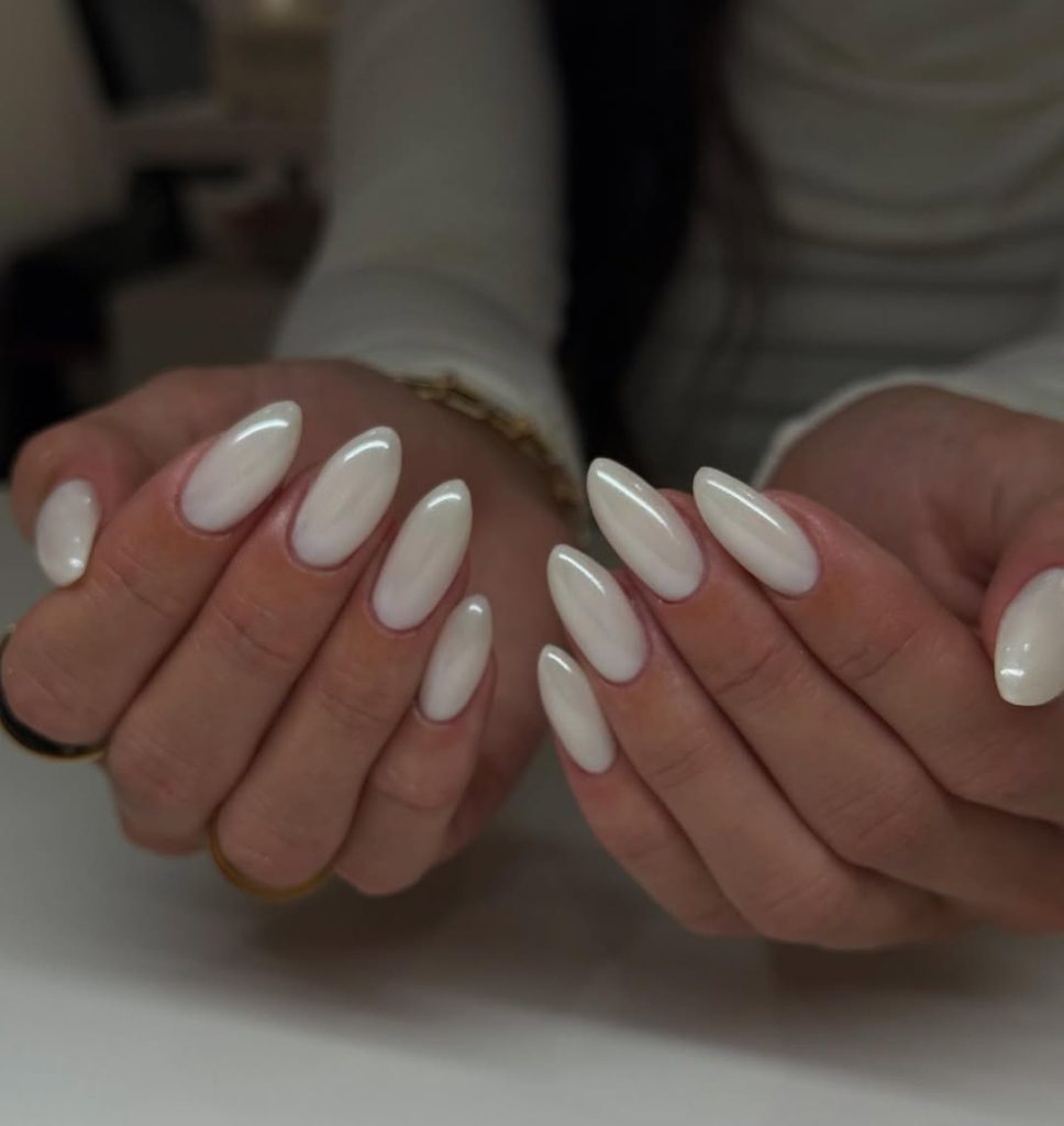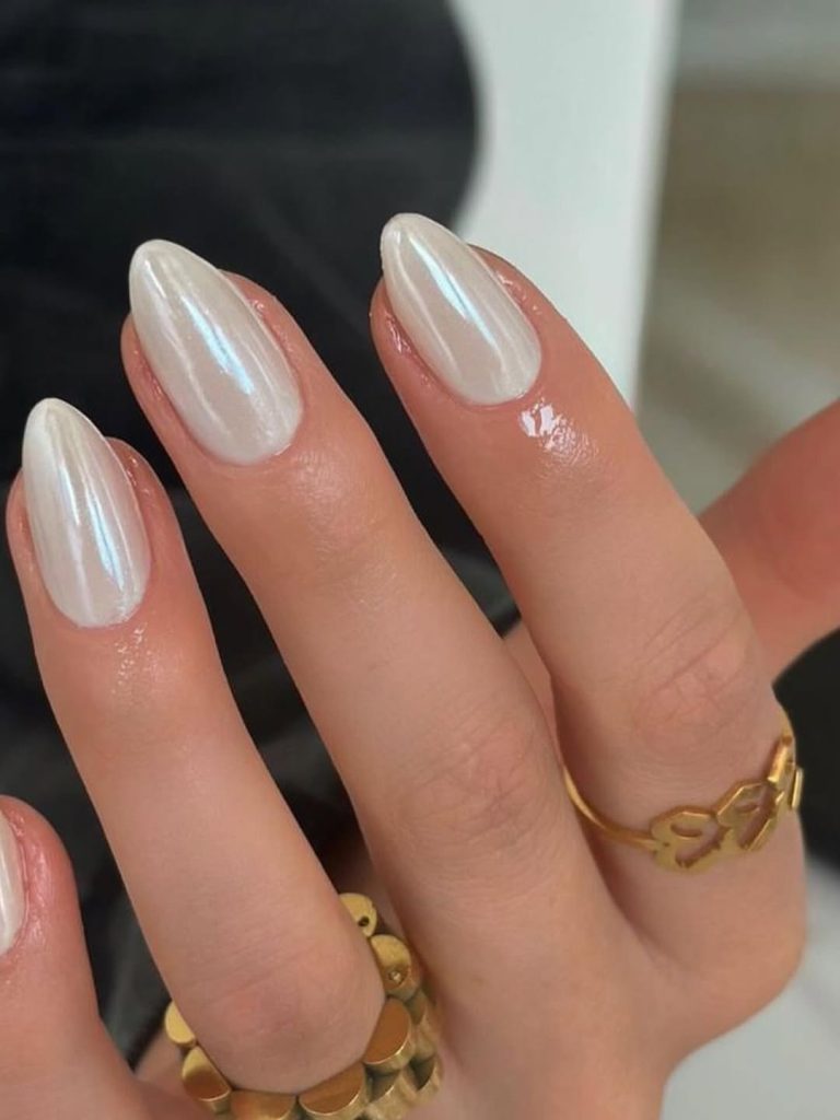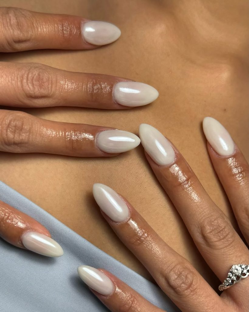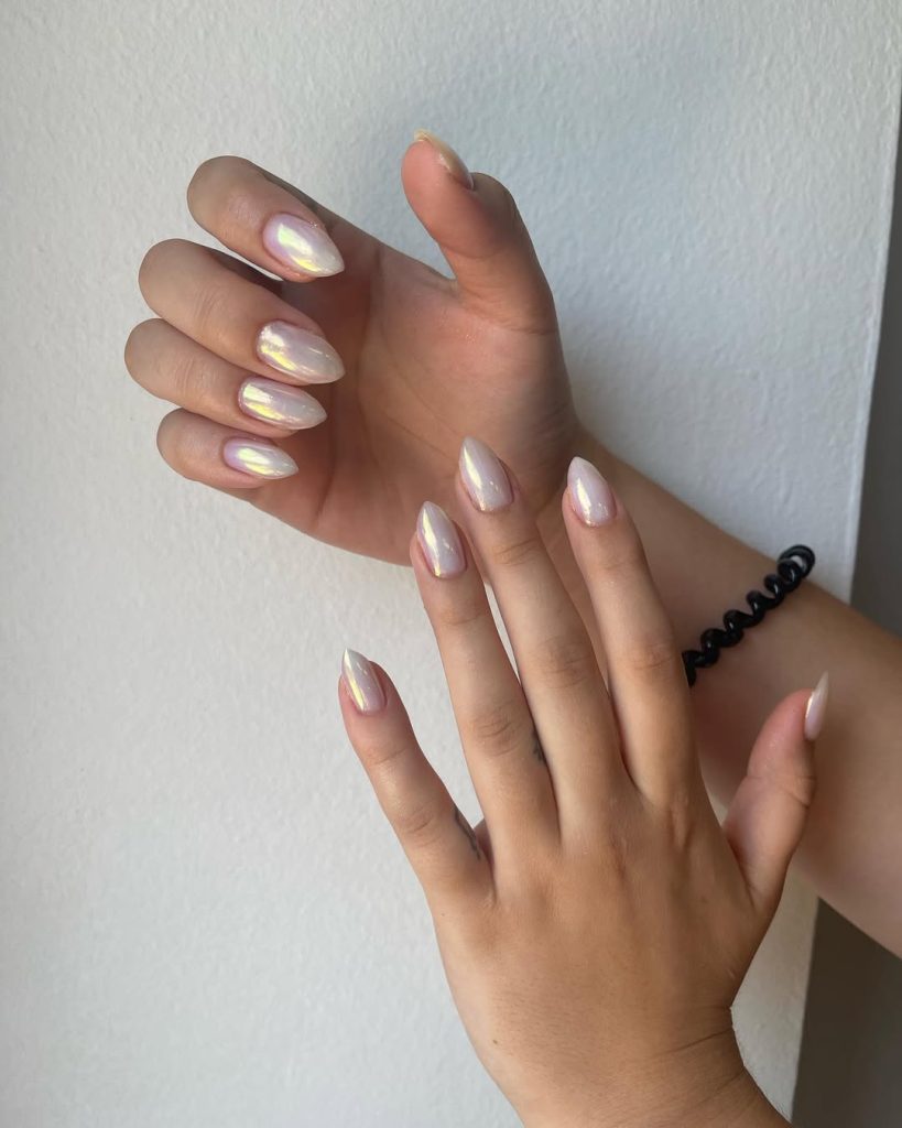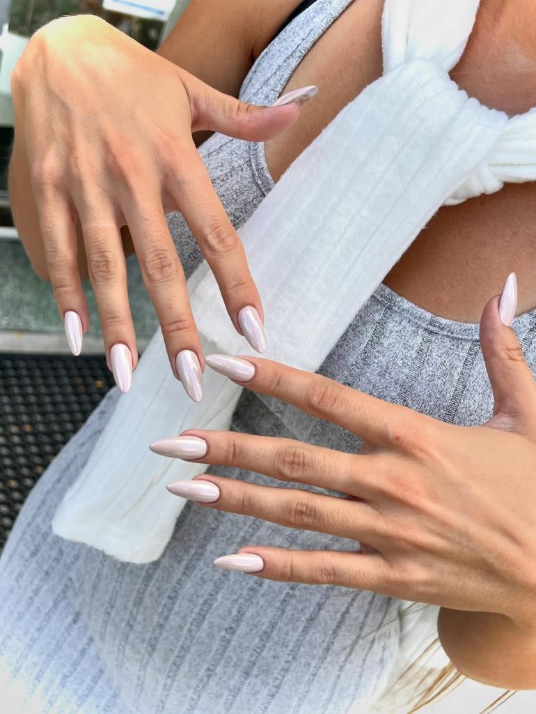 These almond nails work beautifully for women who love elongating their fingers with a sleek finish. They’re perfect if you have medium to long nail beds, and they balance well against both casual denim or a night-out look with gold jewelry. For upkeep, a light buff and chrome powder application will keep that pearly sheen flawless for weeks.