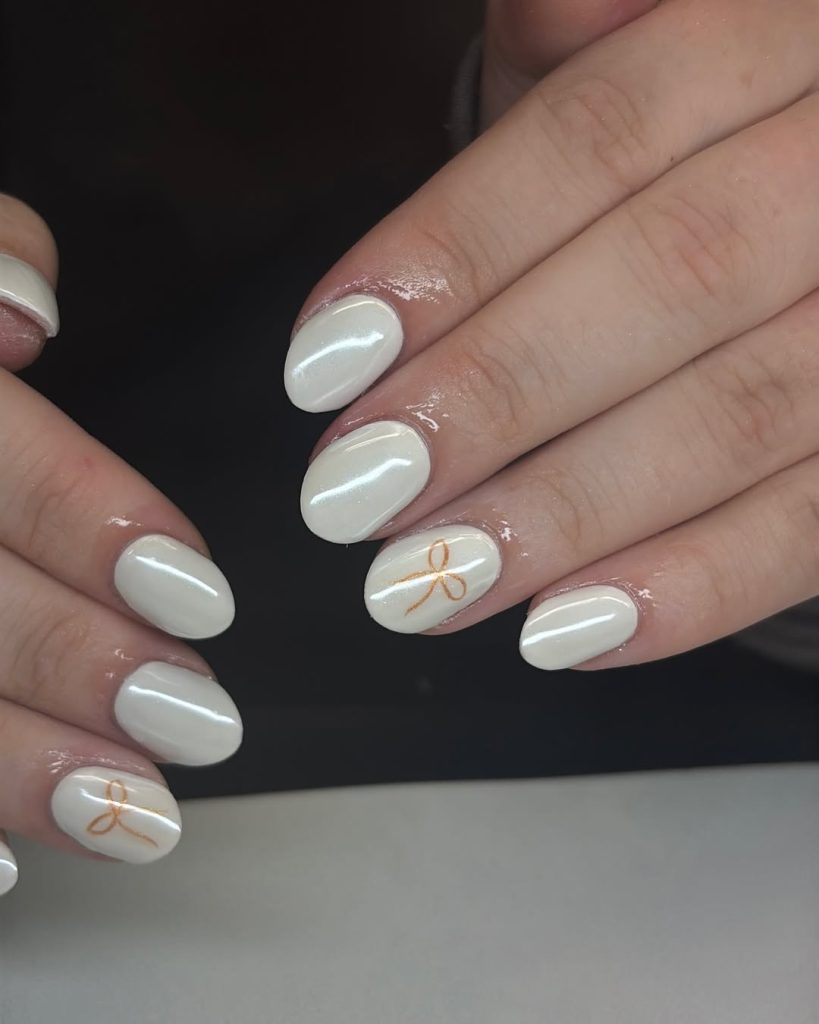 Here’s a playful twist on chrome nails: a delicate gold bow detail sitting atop glossy white nails. It feels youthful yet refined, adding just enough charm without taking away from the sleekness of the chrome finish. The bow makes the manicure feel festive and unique.