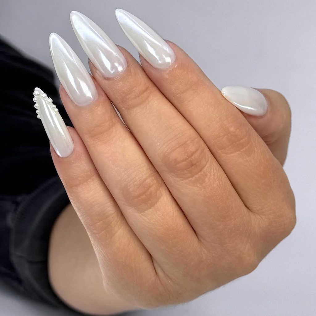 This set is pure luxury—white chrome almond nails dressed up with pearl accents. The pearls frame the nails like tiny gems, adding texture and dimension while still keeping the overall look soft and feminine. It’s romantic, sophisticated, and just a little bit extra in the best way.