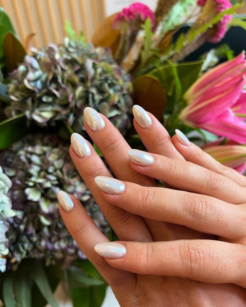These nails are all about timeless beauty—a soft almond shape glazed with a pearly chrome finish that glows softly under the light. They strike the perfect balance between elegant and modern, offering that “just right” vibe for any occasion.