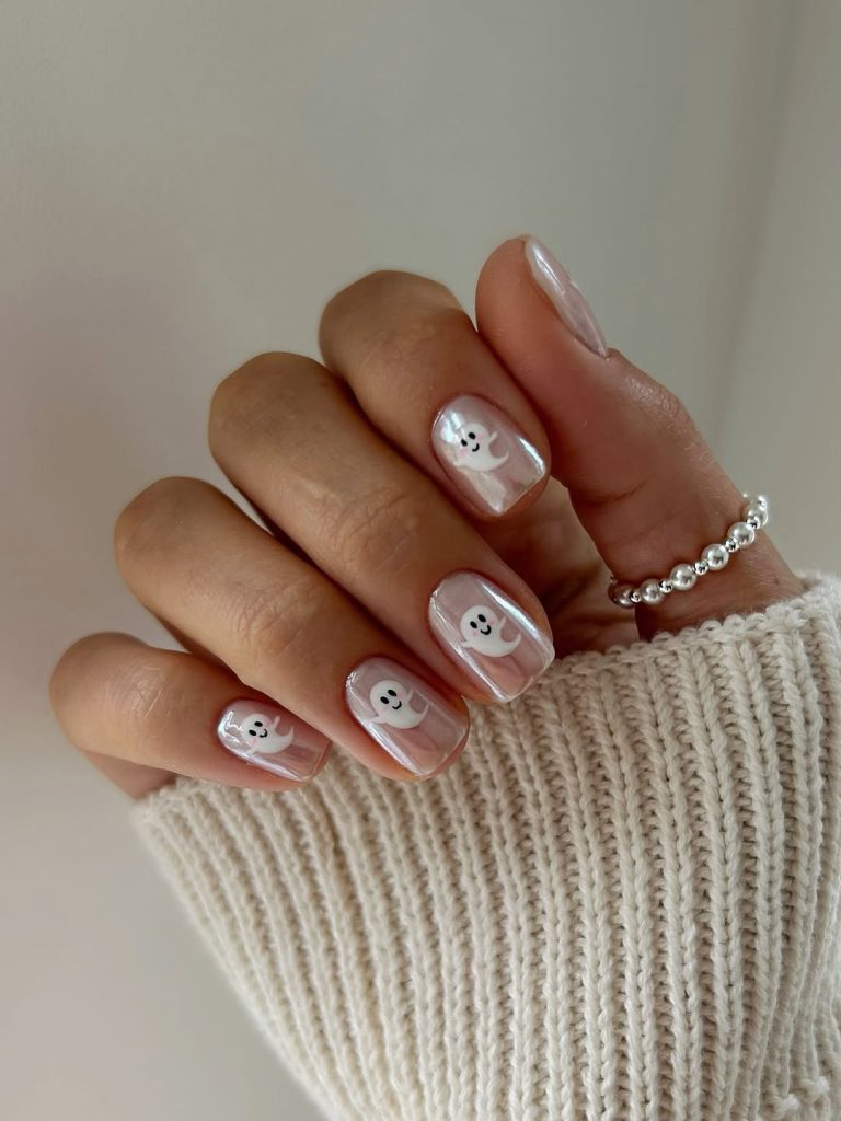 Who said white chrome had to be serious? This look combines the pearlescent base with some cute ghost designs that add an almost whimsical touch to the overall look. This look shows that sometimes being trendy can be fun.