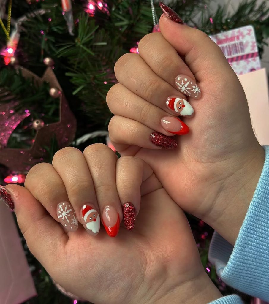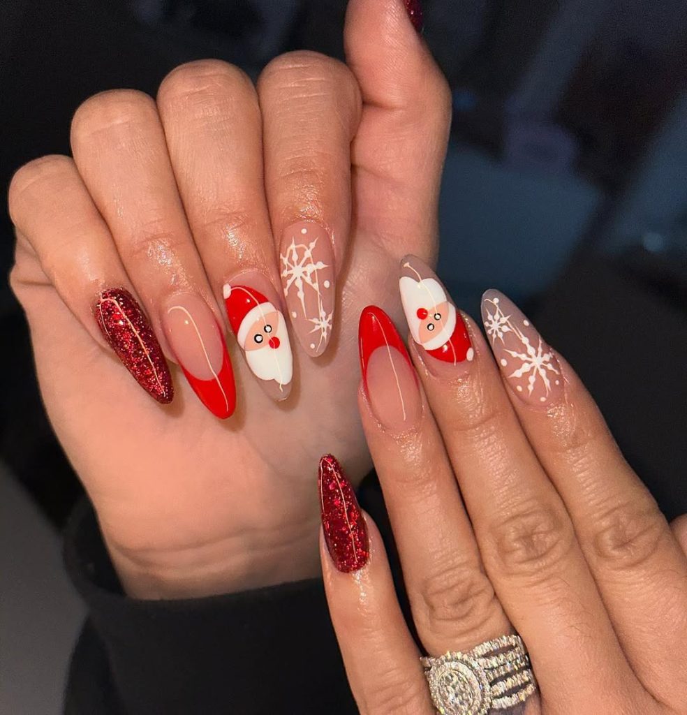 The charm of Christmas comes alive with this playful almond nail set, featuring Santa faces, bold red tips, glitter accents, and delicate white snowflakes. It’s a joyful mix of festive spirit and sparkling details, perfect for women who love their holiday style to feel fun and expressive without losing elegance. The combination of red, white, and glitter creates that unmistakable December glow.