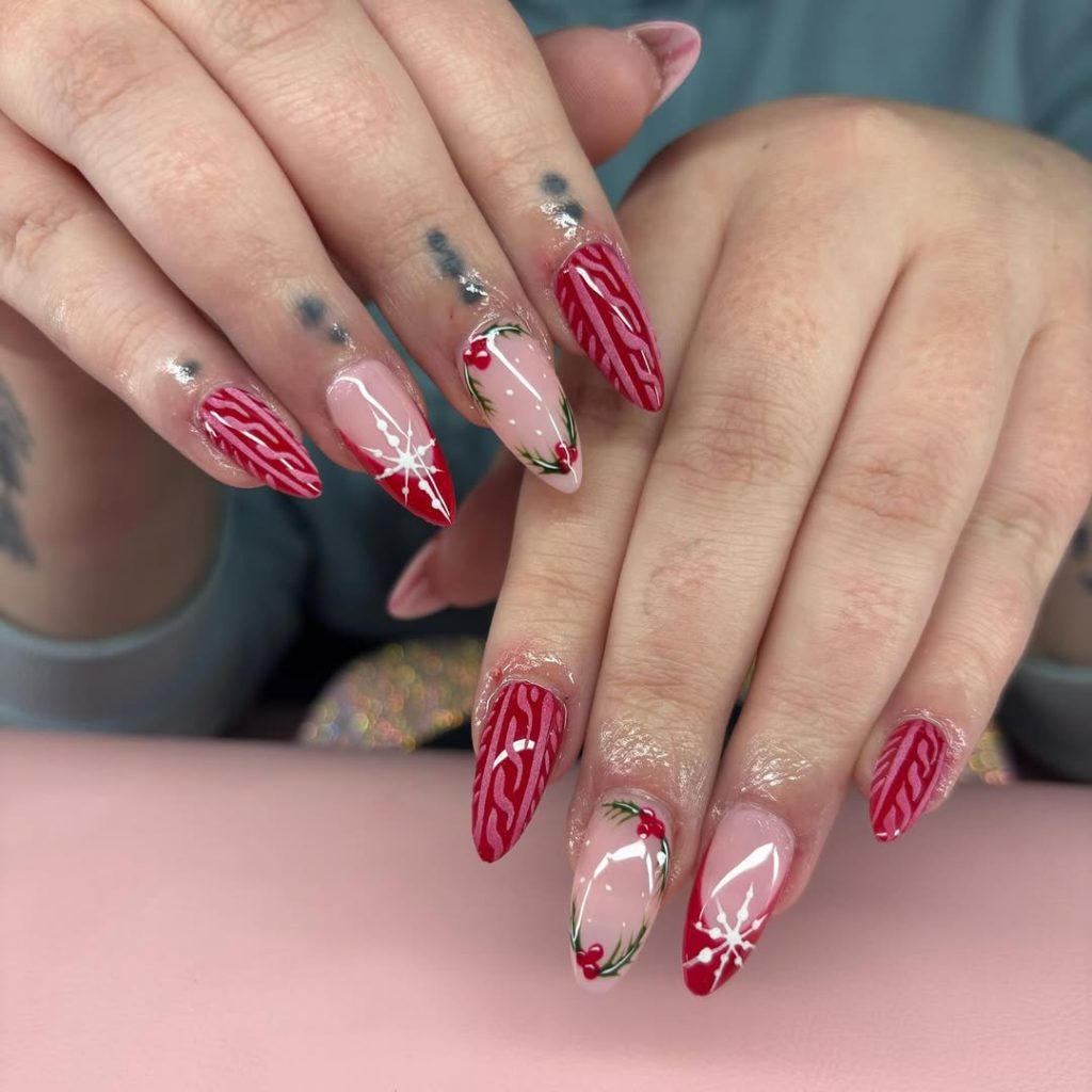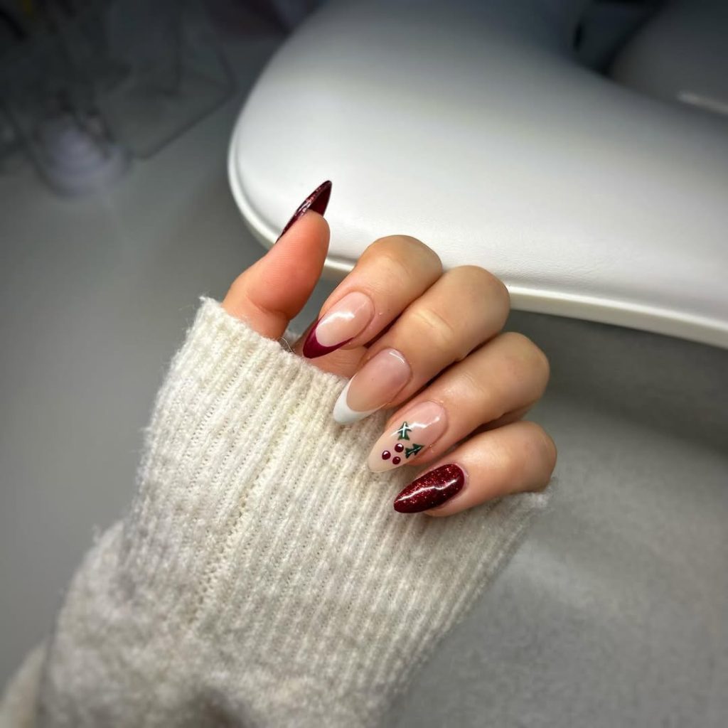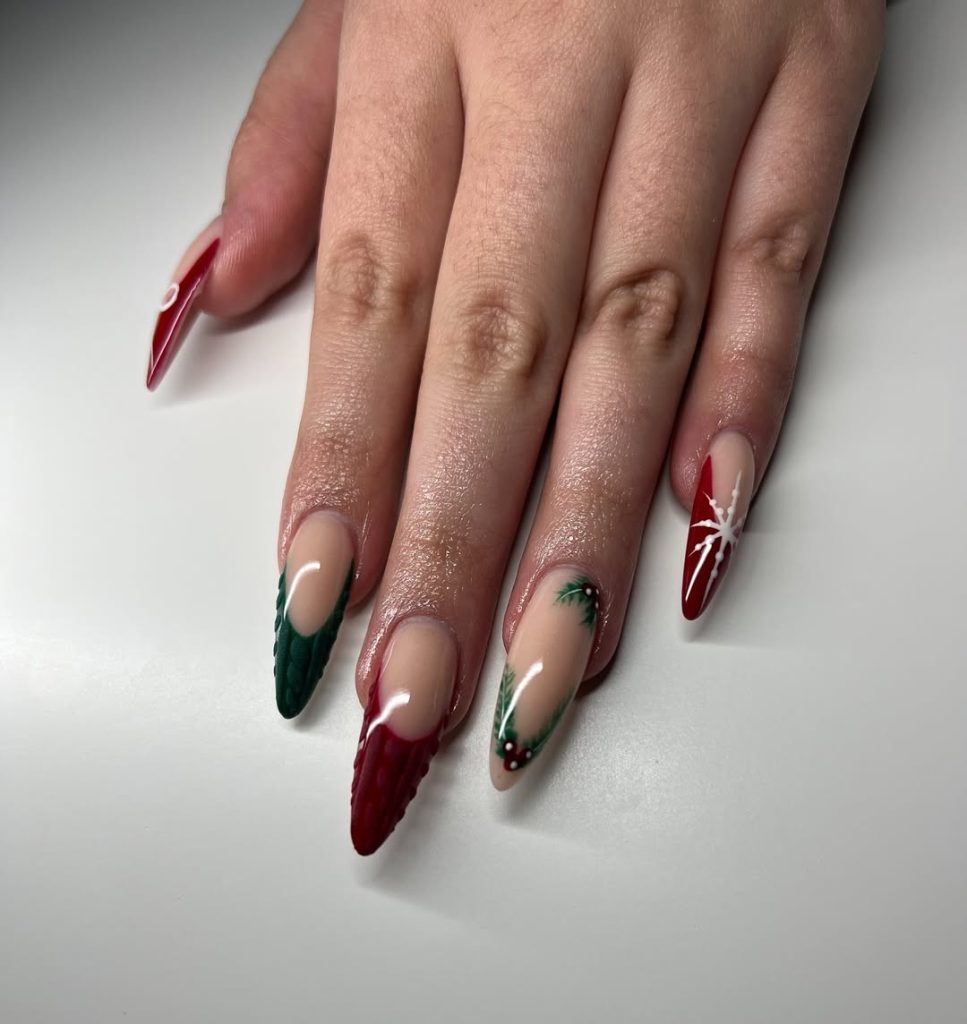 Perfect for women who want classy designs that still have personality, this look fits medium length almond nails especially well. The textured green and red tips add a unique twist, while the accent art keeps it festive but not overwhelming. It’s an idea that suits colder winter days, pairing perfectly with chunky knits and hot cocoa by the fire.