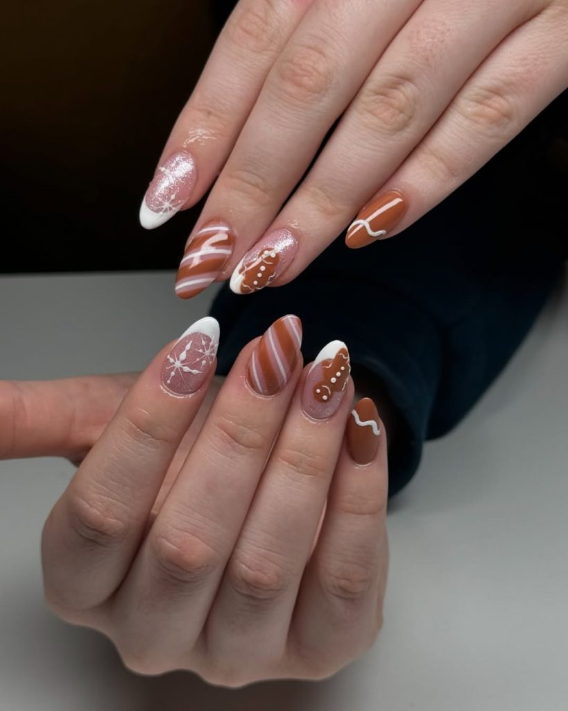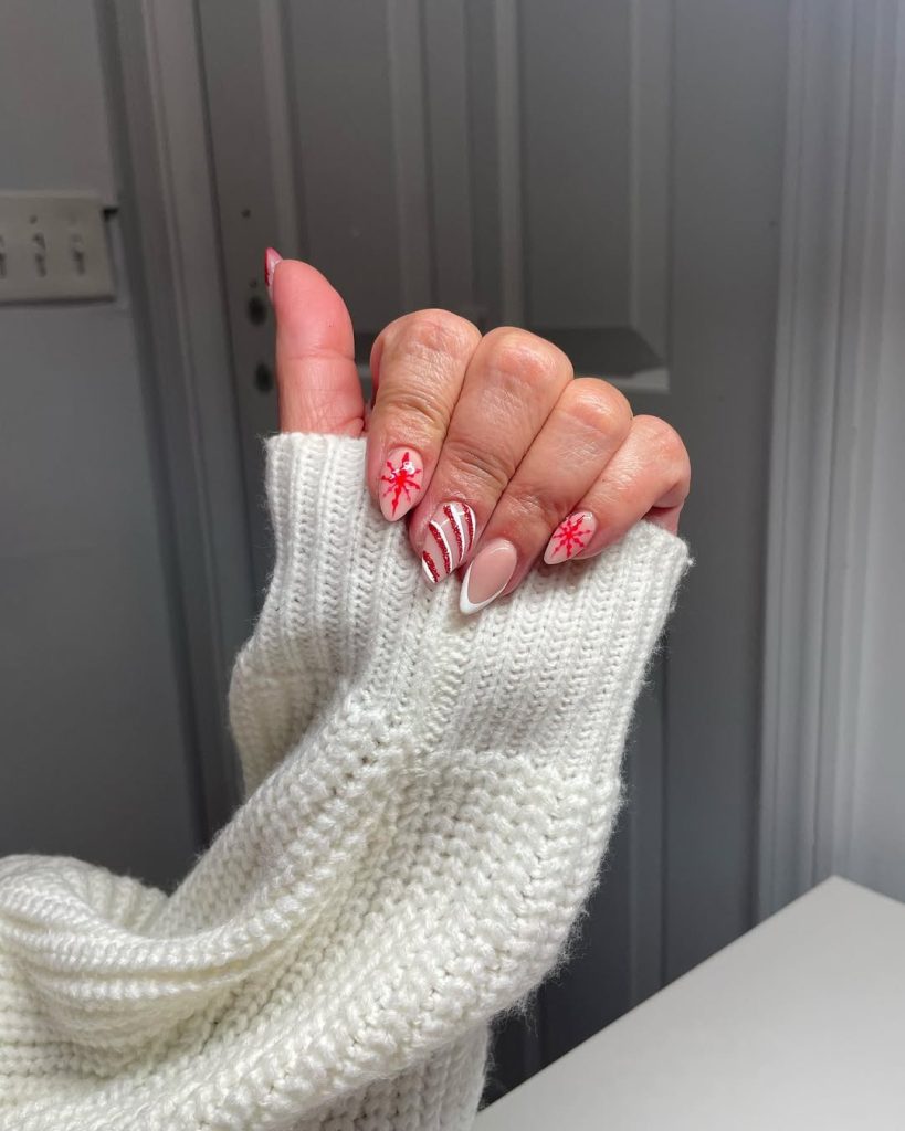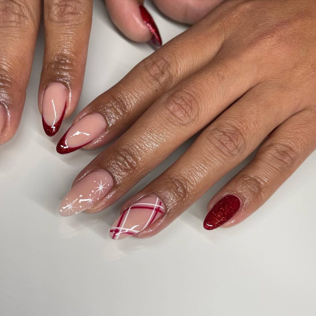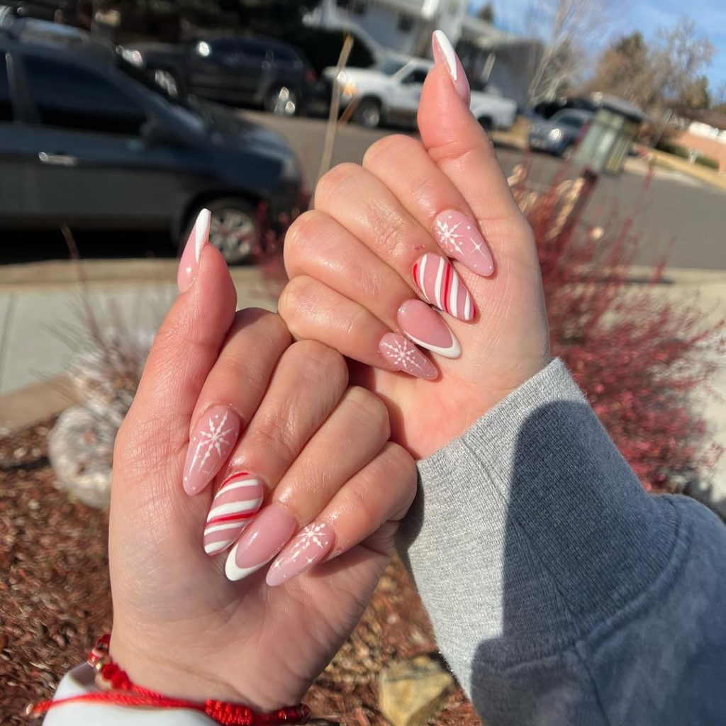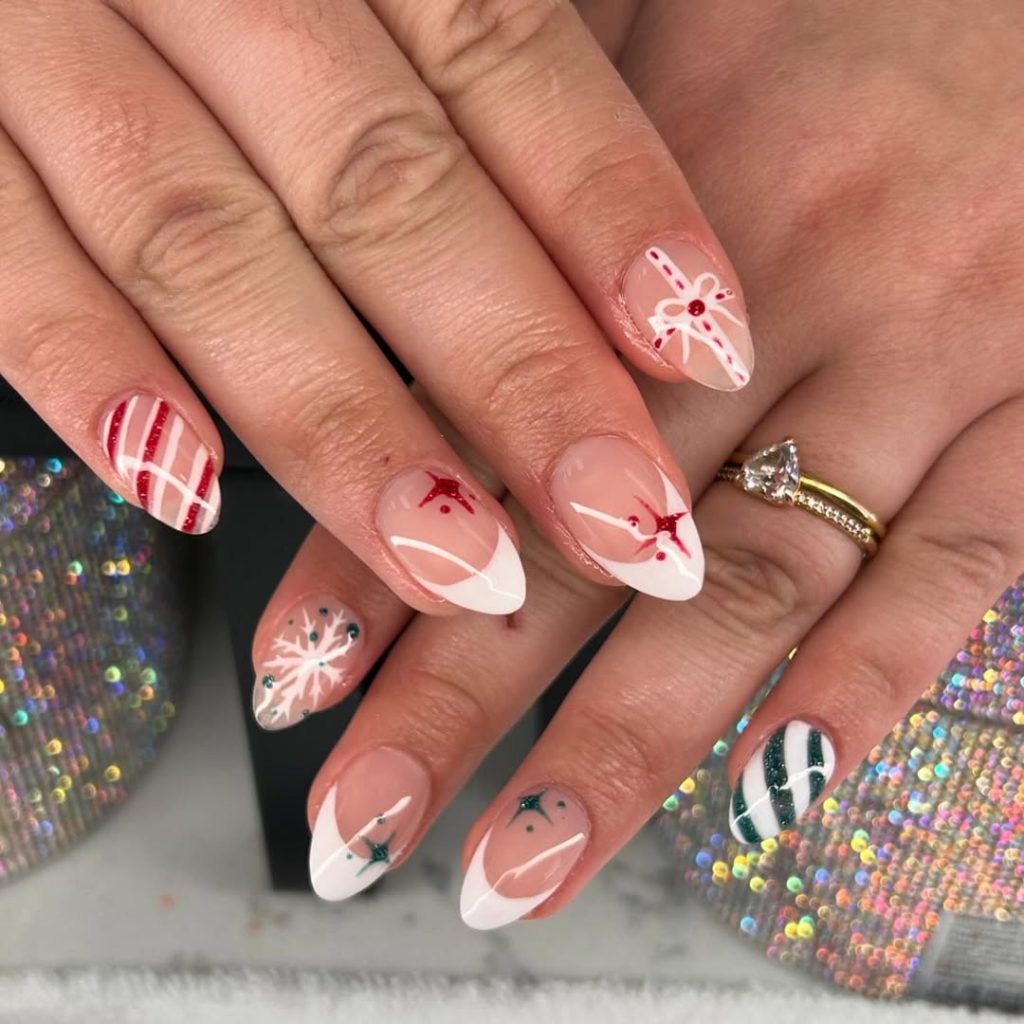Why settle for one holiday detail when you can have them all? From candy cane stripes and French tips to stars and snowflakes, this mix-and-match set has everything in a playful vibe. A little variety keeps the look light while almond-shaped nails keep it chic.