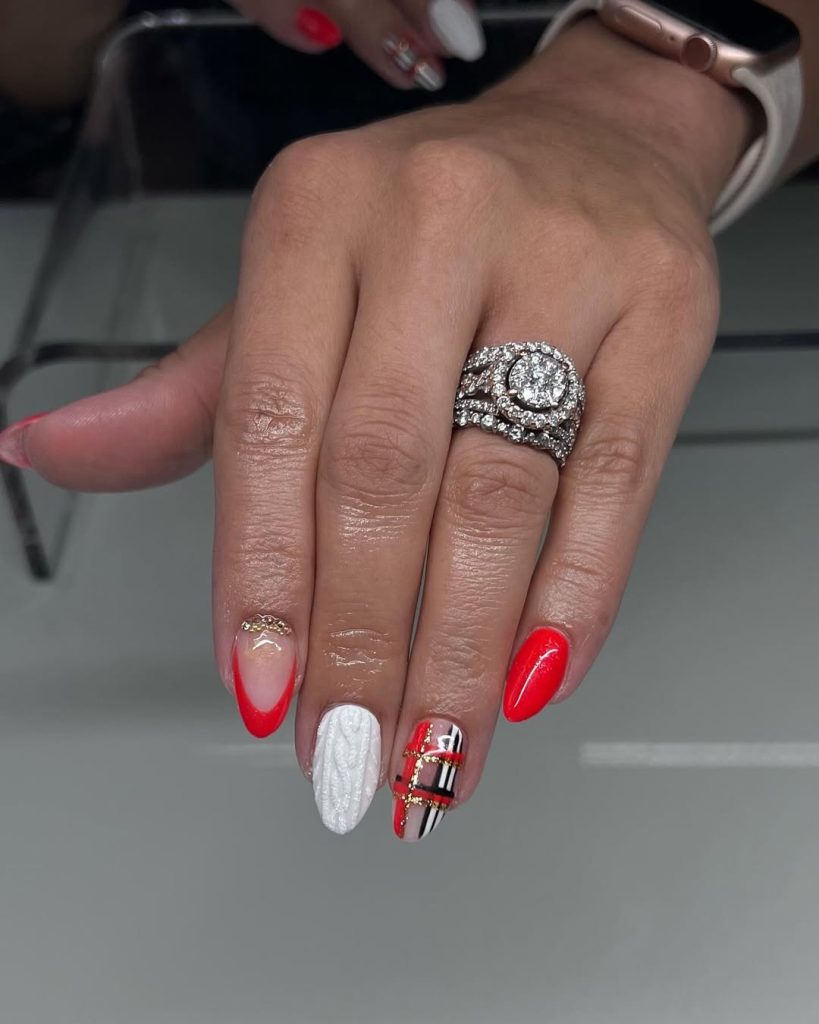 Bold reds and whites create an intense but cozy winter set. With an accent nail featuring texture inspired by sweaters, complemented by plaid patterns, plus a whisper of gold, these nails could be considered a chic rendition of Christmas classics. The almond shape adds a bit more refinement to this playful contrast of textures.