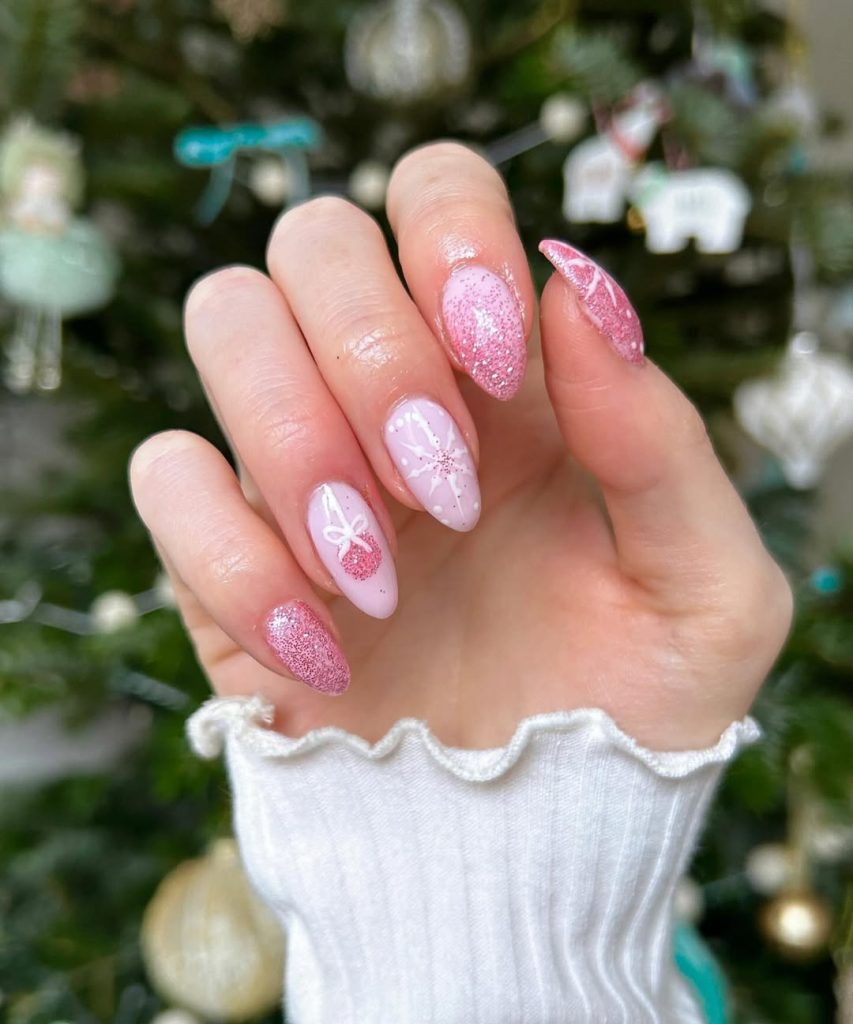 For a softer, whimsical holiday feel, these pink-glitter nails sparkle with charm. Delicate snowflake and ornament designs make the set feel like a gift wrapped just for you. Almond can keep the pink tones very classy while the glitter provides a lot of festive sparkle.