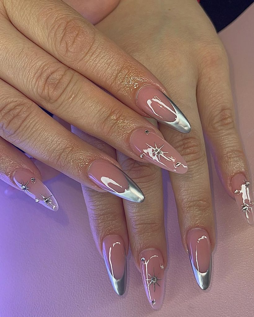 For a modern twist on holiday nails, this silver-tipped almond set is a stunner filled with futuristic sparkle. These are metallic French tips with starry details over a soft pink base, so effortlessly beautiful and vibrant colors like a snowy night under twinkling lights. That feeling so classy and festive-so much shine to go around!