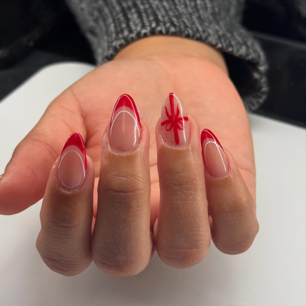 This playful set takes its inspiration from wrapped Christmas gifts, pairing thin red French tips with a bow accent that ties everything together. Minimal yet charming, it’s perfect for the lady who prefers her subtle details with a dab of holiday flair.