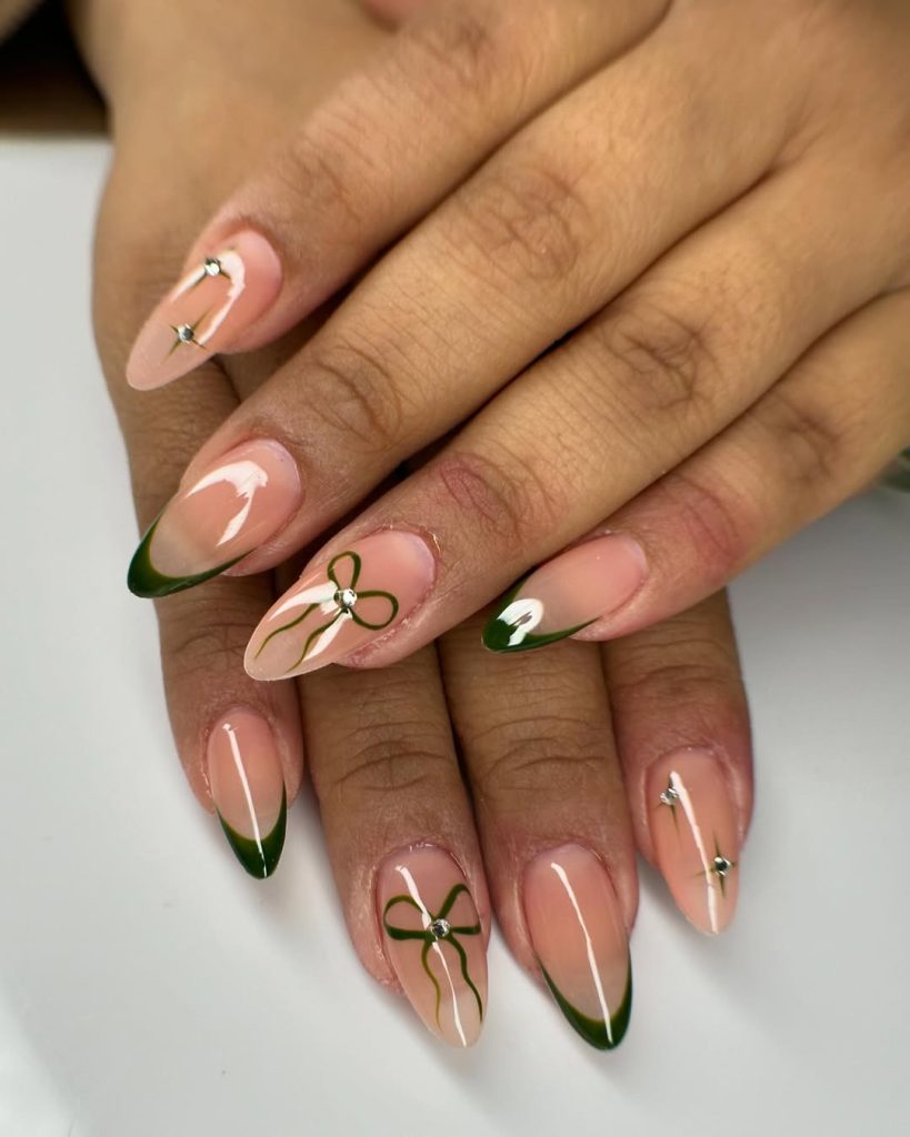 These nails look like beautifully wrapped gifts with deep green French tips and delicate bow details outlined in gold. The glossy finish, combined with the almond shape, really gives this manicure a unique and somewhat luxurious festive flair.