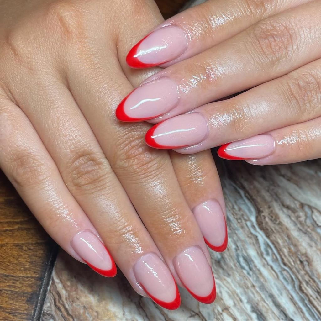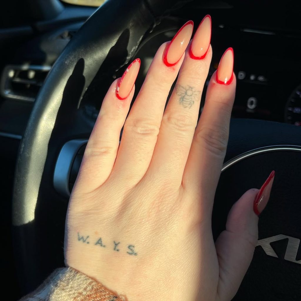 Red French tips feel somewhat traditional- more so when worn on almond nails. The set comprises soft nude bases and sharp winter red tips, creating a clean, more festive look. It feels like the kind of design that is simple but firmly makes an impression during the holidays.