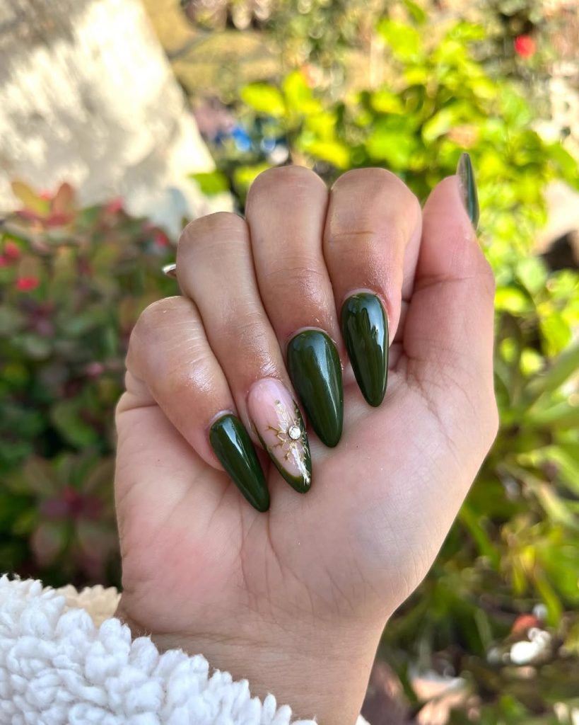 Deep and magnificent, the set features glossy deep green nails with a sparkling gold snowflake as an accent. The almond shape is pure indulgence for the color, and the accent detail lends just a hint of crisp holiday spirit.
