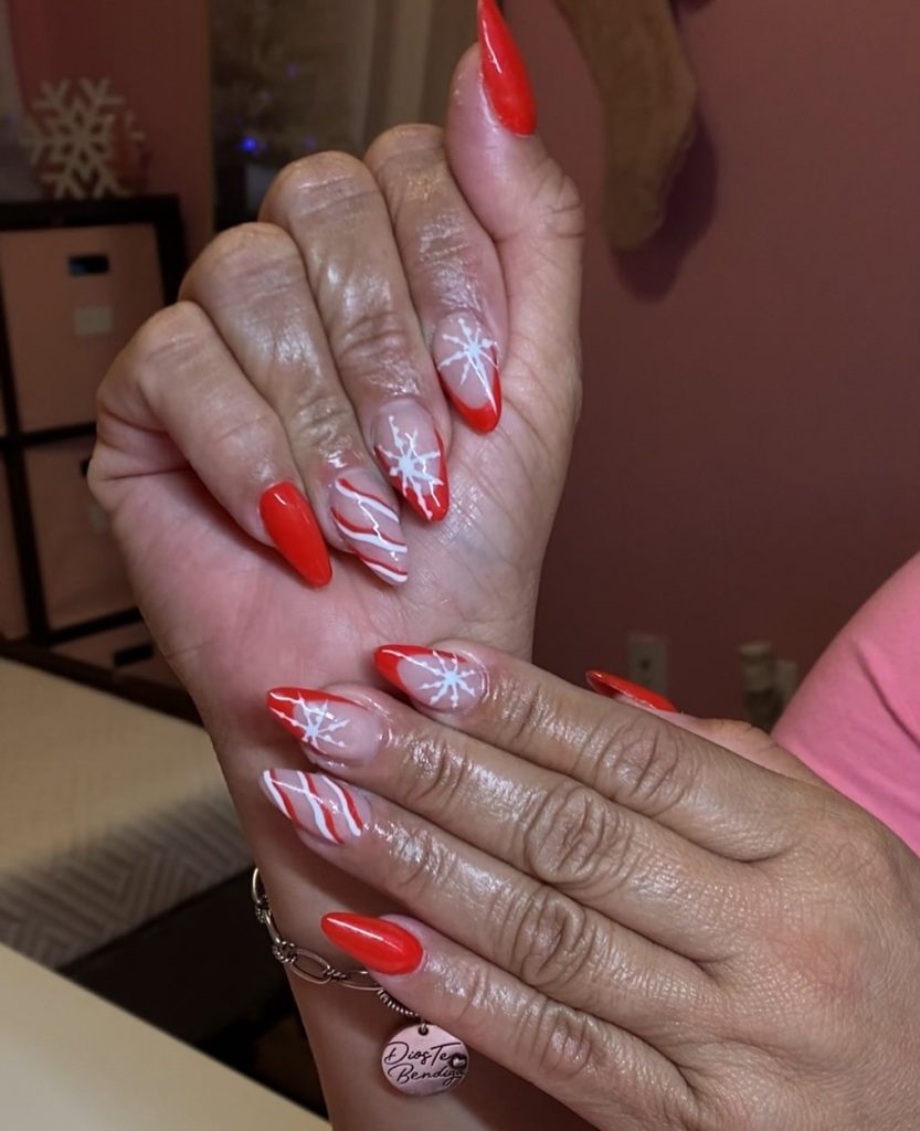 A design that works magnificently for women who love cute yet classy holiday inspo. Suitable for medium-length almond nails, the red and white contrast is utterly classic, while the snowflakes lend a titch of wintery magic. It is a very versatile option, holding its appeal for informal sweater days and for formal Christmas dinners.