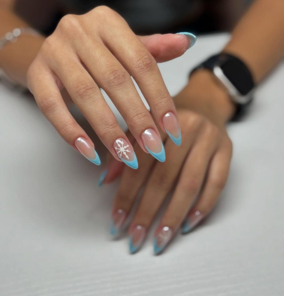 Perfect for women who love classy and timeless inspo, these nails flatter every skin tone and look great on both short and long almond shapes. The French tip design makes them versatile, while the snowflakes add a playful yet elegant winter touch. They’re the kind of nails that feel right at home at a holiday party or a snowy weekend getaway.