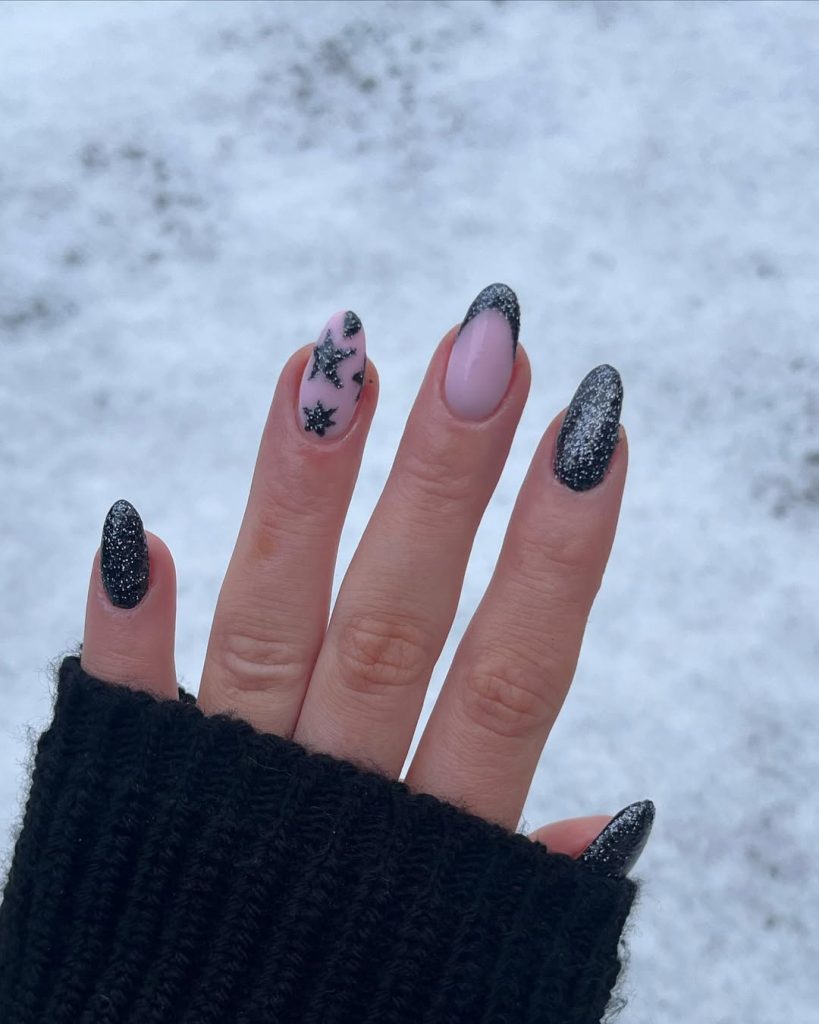 Not all holiday nails need to be red or green—these starry black almond nails are a dazzling reminder of winter nights. A mix of glitter tips, matte stars, and a soft pink base captures the magic of Christmas lights against a midnight sky. It’s bold, unexpected, and effortlessly modern.