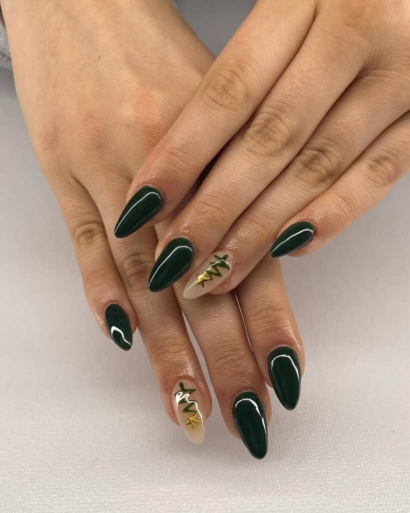 Deep green nails make a big statement, with little golden stars and tree silhouettes to boot, celebrating the winter season. The almond shape emphasizes the sleek dark green as a rich-and-elegant base that feels positive and yet festive.