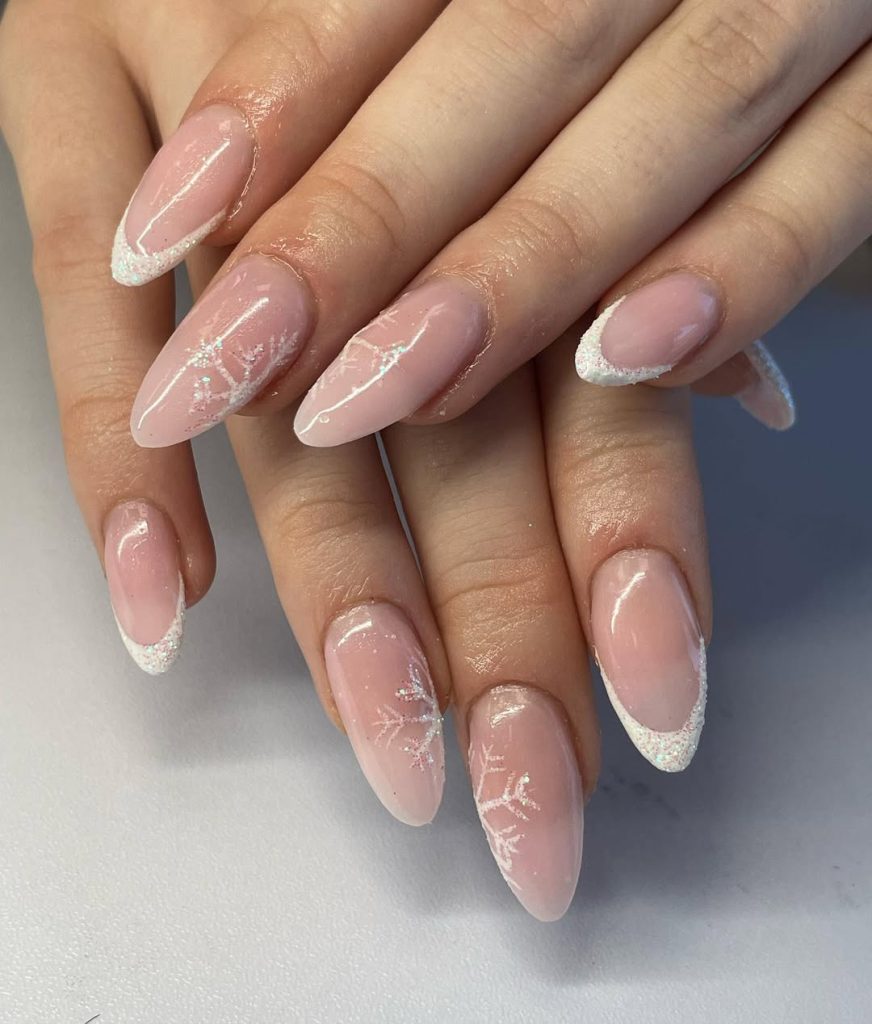 Like freshly fallen snow, this manicure combines translucent pink bases with glittering winter white French tips and delicate snowflake art. The look feels clean, crisp, and magical, bringing out the frosted beauty of the season in a subtle, sophisticated way.