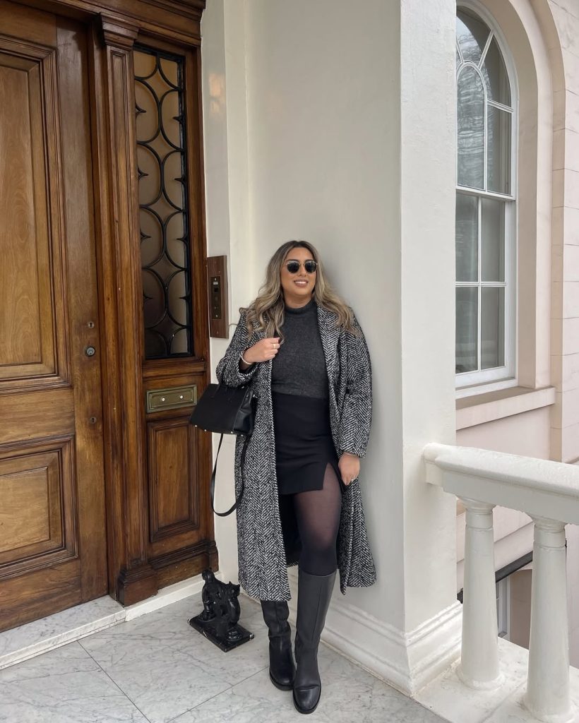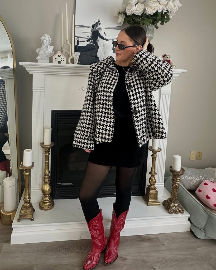 This look leans into contrast—sharp patterning paired with a flirtier silhouette. It’s adorable, bold, and unapologetically expressive, proving cold spring style doesn’t need to feel muted.
