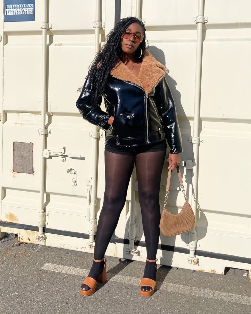 This look delivers attitude and strength, blending glossy texture with structured warmth. It’s unapologetic, modern, and made for standing out.