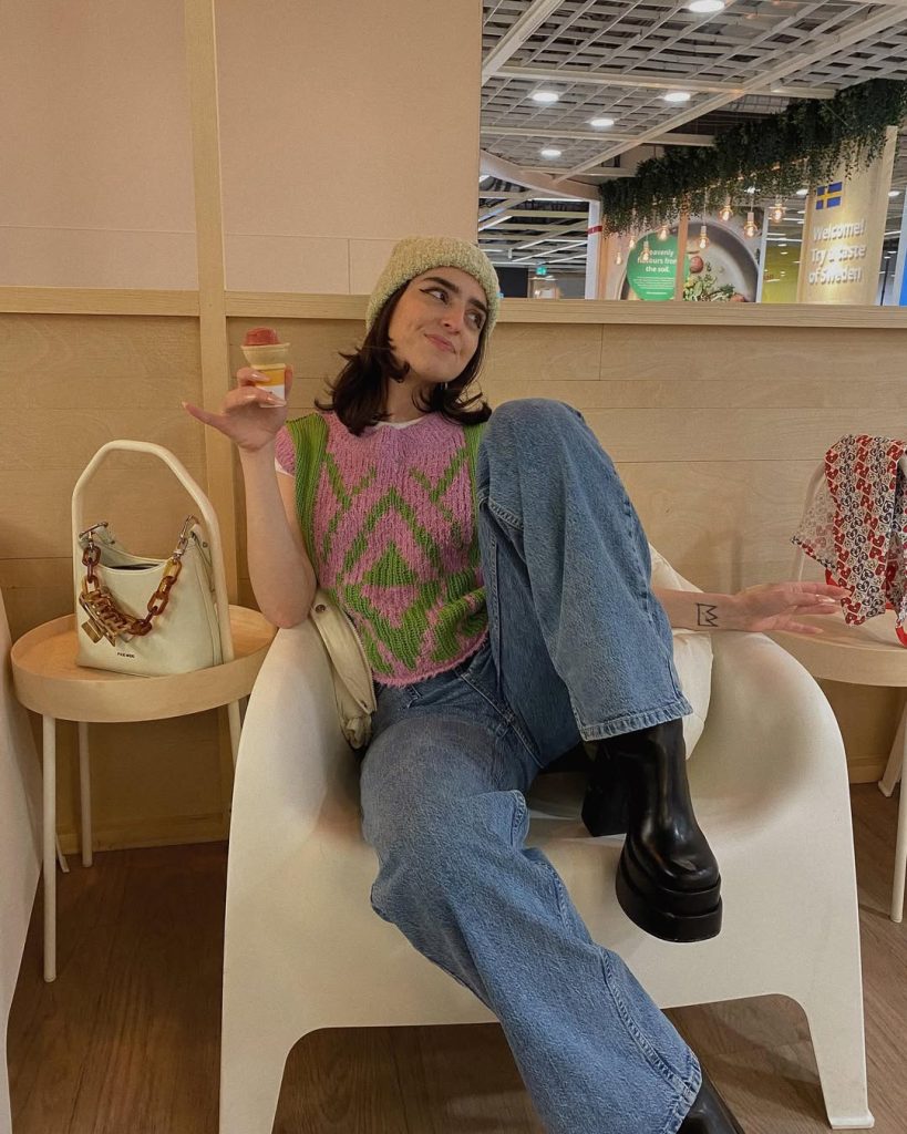 A bold knit anchors this outfit, creating contrast against tailored pieces. It’s confident, expressive, and quietly strong.