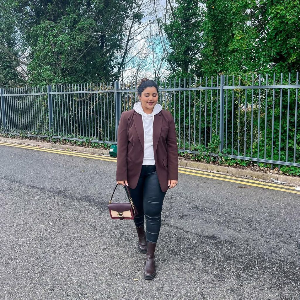 This outfit blends gentle tailoring with personality-driven accessories, creating a look that feels expressive without being loud. It’s especially refreshing for plus-size styling in colder spring weather.