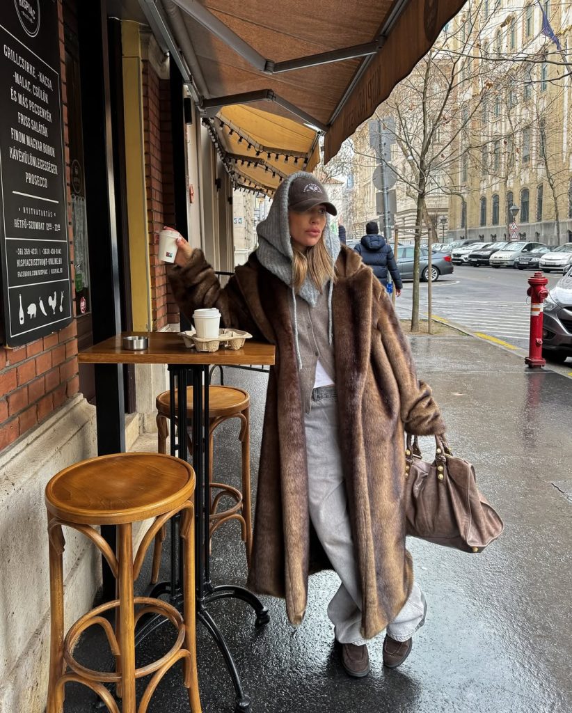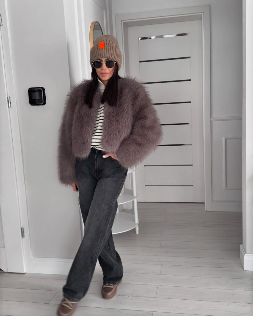 This ensemble leans into rich winter textures: a voluminous faux-fur coat matched with warm brown tones. It’s elegant, dramatic, and speaks to both modern flair and classic sophistication.