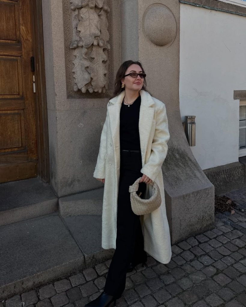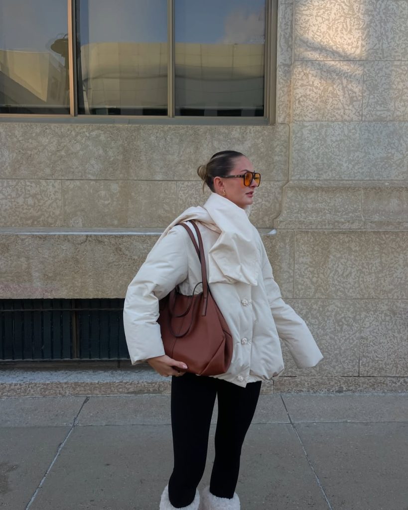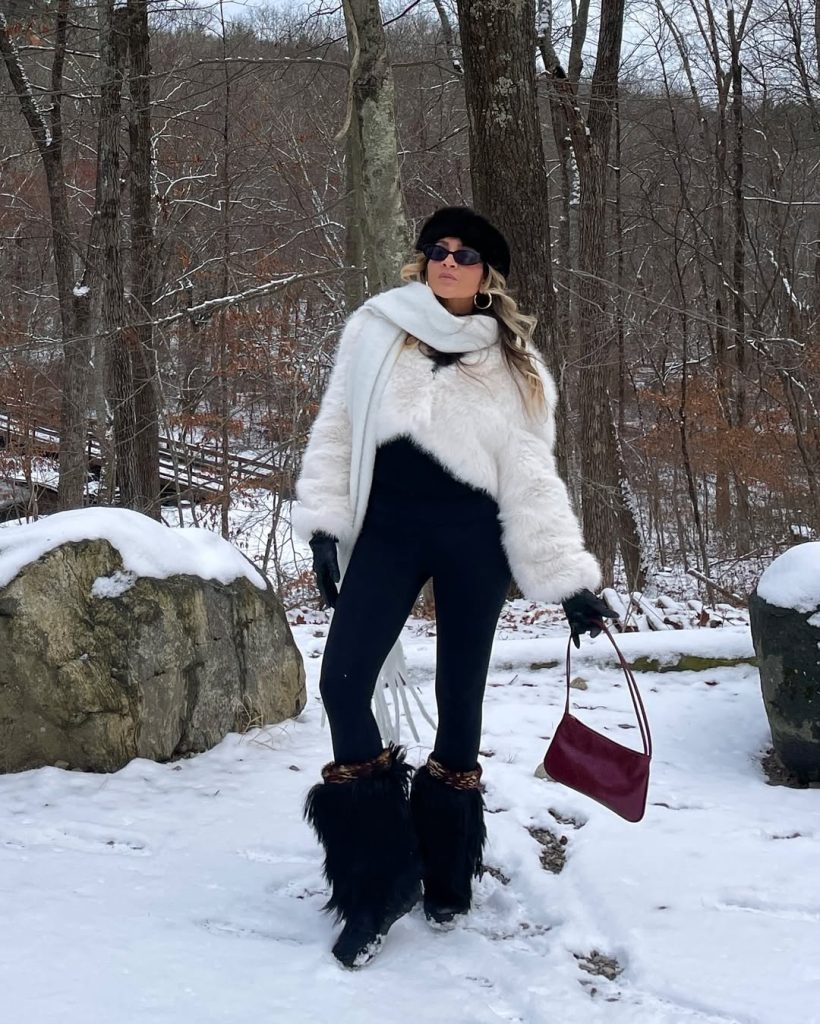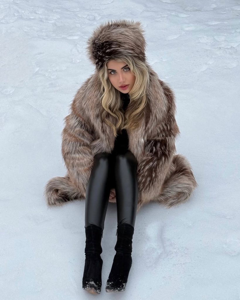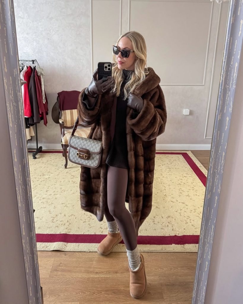 Bold, cinematic, and undeniably warm—this look leans into luxurious textures that make cold-weather dressing feel indulgent. The combination of a voluminous coat and sleek leggings creates striking contrast.